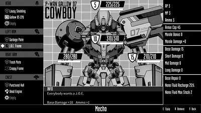 Wolfstride is a role-playing game about three former partners-in-crime coming to a turning point in their lives. When they inherit a junkyard mecha called Cowboy, they reunite to enter the planet’s most elite mecha competition: the Ultimate Golden God Tournament. Each member of the team lends their unique experience as they prepare to outwit the best mecha opponents from around the world. Between dog-mechanic Duque, mecha pilot Knife Leopard, and jack-of-all-trades Dominique Shade, the core crew’s got just about everything covered. That is… until their simple mission to make money unfolds into a deep, slow-burning exploration of their complex lives, the dark choices of their past, and their inevitable fate. The hangar is Duque's domain. Repairing damage between battles is just the beginning. Swap out parts, install upgrades, and add new weapons to improve Cowboy and perfect the custom loadout designed to beat your next opponent. Take the role of exiled former Yakuza, Dominique Shade, to explore every quirky corner of Rain City. A half dozen establishments introduce a kaleidoscope of characters, each offering support, a job, or a biting insult to your journey. Enter the arena to fight it out in giant robots one on one. The turn-based battle system rewards preparation and strategy. Move carefully to get in the best position to attack and keep the enemy off-balance. Target attacks to wear down your opponent or go on the defensive when the fighting gets too hot.