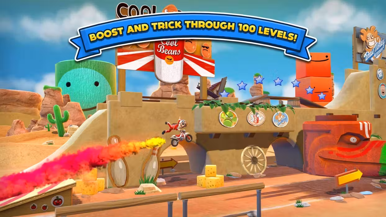 Can you put the world’s most determined stuntman back into the limelight? Combo, boost and pull ludicrous stunts as Joe attempts to race his way back into the record books in over 100 eye-popping levels. Leap school buses full of screaming kids and pools of ravenous sharks! Dodge spikes and mousetraps! Speed through coin dashes and beat Team Nasty in nip-and-tuck races! Take on and win the super-challenging Pro Medals in every level!