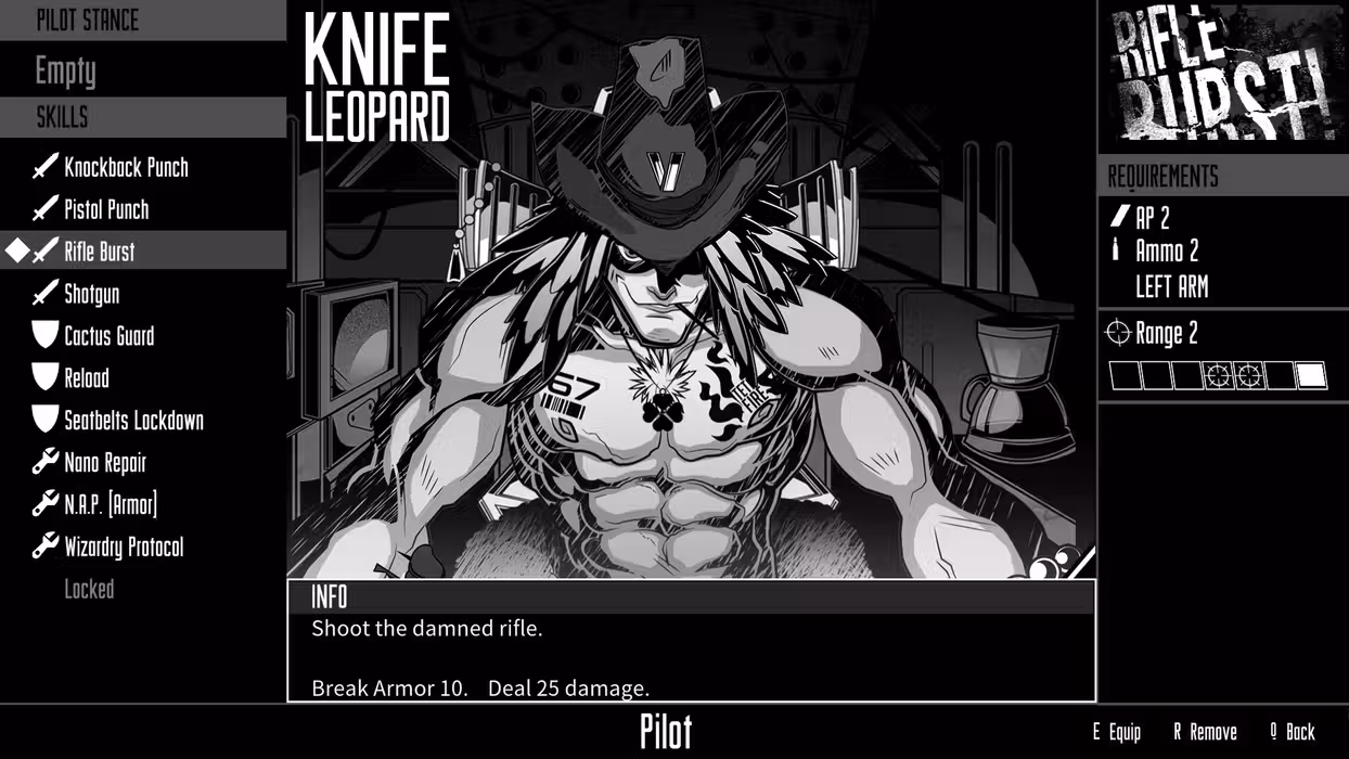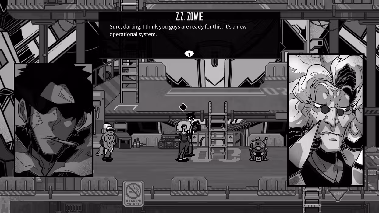 Wolfstride is a role-playing game about three former partners-in-crime coming to a turning point in their lives. When they inherit a junkyard mecha called Cowboy, they reunite to enter the planet’s most elite mecha competition: the Ultimate Golden God Tournament. Each member of the team lends their unique experience as they prepare to outwit the best mecha opponents from around the world. Between dog-mechanic Duque, mecha pilot Knife Leopard, and jack-of-all-trades Dominique Shade, the core crew’s got just about everything covered. That is… until their simple mission to make money unfolds into a deep, slow-burning exploration of their complex lives, the dark choices of their past, and their inevitable fate. The hangar is Duque's domain. Repairing damage between battles is just the beginning. Swap out parts, install upgrades, and add new weapons to improve Cowboy and perfect the custom loadout designed to beat your next opponent. Take the role of exiled former Yakuza, Dominique Shade, to explore every quirky corner of Rain City. A half dozen establishments introduce a kaleidoscope of characters, each offering support, a job, or a biting insult to your journey. Enter the arena to fight it out in giant robots one on one. The turn-based battle system rewards preparation and strategy. Move carefully to get in the best position to attack and keep the enemy off-balance. Target attacks to wear down your opponent or go on the defensive when the fighting gets too hot.