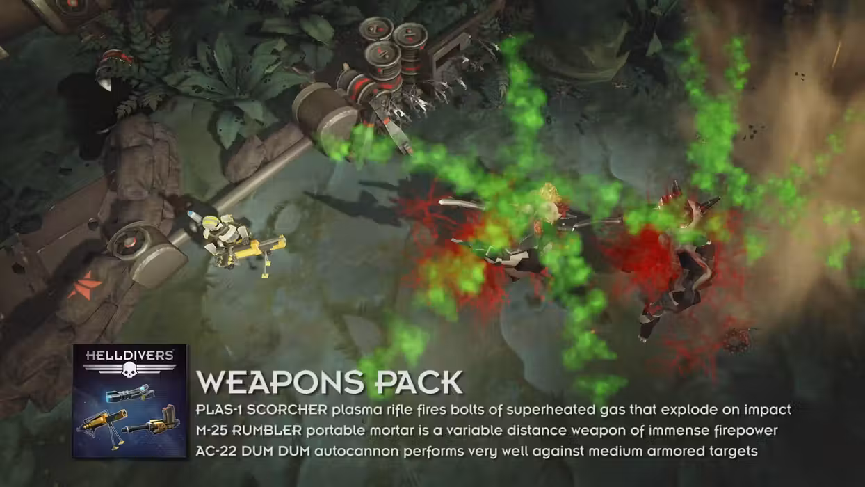 The Weapons Pack is a collection of weapons not normally issued to Helldivers. The weapons are both ultra modern experimental weapons and tried and true workhorses in new formats. The Weapons Pack contains: - PLAS-1 ‘Scorcher’: The first ever Helldiver issued plasma weapon. This primary weapon fires bolts of superheated plasma that explodes on impact. Super Earth scientists have gone to great lengths to ensure that the weapon is safe and reliable to operate, though this adds some limitations to the weapon such as lacking a full auto fire mode. - M-25 ‘Rumbler’: The ‘Rumbler’ is a heavy portable mortar firing three round bursts of 80mm grenades. Though heavy and prone to ammunition shortage, the rumbler has the capability of firing at a variable distance, allowing the user precise control of where the shots land. - AC-22 ‘Dum Dum’: The AC-22 is a 20mm cannon commonly found in the Helldiver arsenal, though usually mounted on vehicles. This is a shoulder carried version allowing for Helldivers on foot to carry a very powerful weapon that is excellent for taking out medium armored targets.