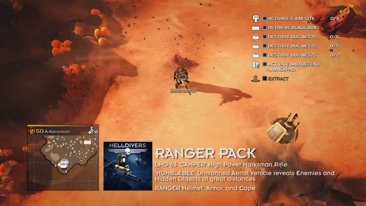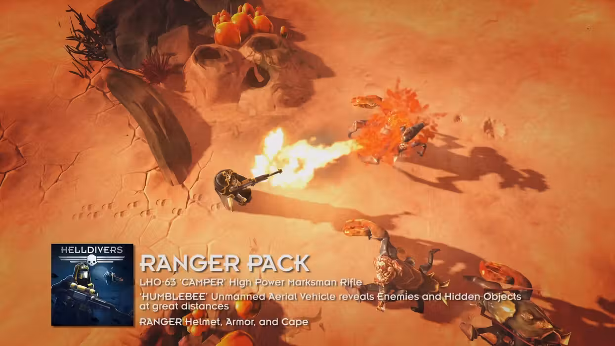 Specially trained in scouting and assassination of high value targets, these Rangers are the first to drop into the unknown. Ranger training was standard procedure for all HELLDIVERS in the early days of SUPER EARTH, but has now become rarer. The Ranger Pack contains: - The Ranger Uniform, a cosmetic helmet, armor, and cape. - LHO-63 ‘Camper’: A designated marksman rifle with high power and accuracy traded for fire rate, few enemies take more than a few shots to kill. - ‘Humblebee’ UAV: An Unmanned Aerial Vehicle, capable of revealing enemies and hidden objectives at greater distances.