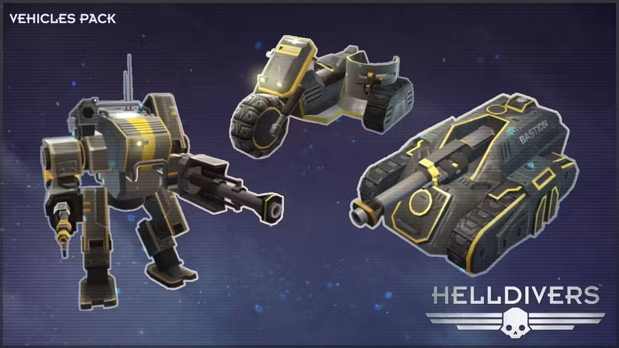 The Vehicles Pack is a collection of highly specialized vehicles. Not normally deployed on missions with Helldivers, they are excellent assets for when you need some fast transportation or some heavy armor. The Vehicles Pack contains: - TD-110 ‘ Bastion’: A small fairly mobile tankdestroyer, prized for its incredibly powerful main gun, large ammunition storage, and heavy armor. It controls differently compared to other vehicles and require far more coordination between the driver and gunner compared to other vehicles. - MC-109 ‘ Hammer’: A sturdy combat motorcycle complete with sidecar. This is a lightly armored vehicle with high speed, excellent for when you want to move fast. Upgrades also arms it with a standard machine gun, though it provides some firepower, it is more for self defense than attack. - EXO-51 ‘Lumberer’: An anti-tank specialized exosuit incorporating a 90mm cannon and a flamer into it’s design. Though the cannon is very powerful, it has a low ammunition supply and some severe accuracy issues unless standing still.