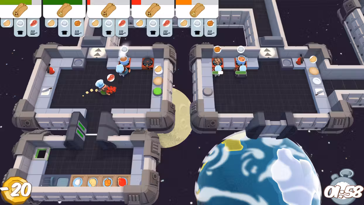 Overcooked is a chaotic couch co-op cooking game for one to four players on Xbox One, PlayStation 4 and PC. Working as a team, you and your fellow chefs must prepare, cook and serve up a variety of tasty orders before the baying customers storm out in a huff. Sharpen your knives and dust off your chef’s whites, there isn’t mushroom for error and the steaks are high in these crazy kitchens!