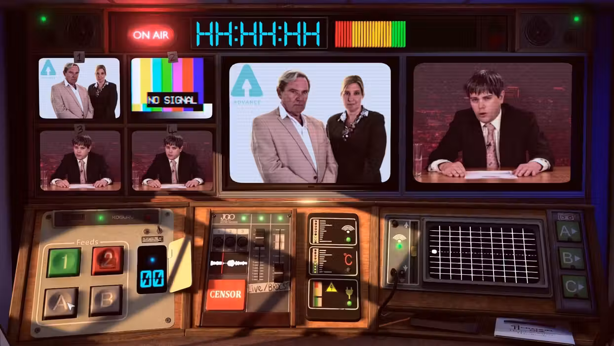 Take control of the National Nightly News as a radical government comes to power. In this immersive, high-pressure, propaganda sim, you control what the people see and determine what’s Not For Broadcast. "Look, mate - it’s not that hard. Choose the angles, roll the ads, and bleep the swears. Just keep in mind that how you show these people will change their lives. Don’t worry - you’ll get paid either way! In an alternate 1980s where the nation stumbles towards dystopia, join the National Nightly News team as they document the latest political scandal, the rise of a radical government, and which celebrity has for some reason written a book about it all. You only came in to clean the studio - but in a bizarre twist of fate, it's now up to you to determine exactly what goes on air. Not For Broadcast is an immersive, narrative-driven propaganda sim that lets you set the agenda. Mix four camera feeds, choose the headlines, bleep the bad language - all under the pressure of a live broadcast. Will you censor the news and be rewarded, or expose the truth and live with the consequences? Not For Broadcast is heading into Early Access with three full chapters, and will work alongside the community to a full ten chapters, with varied consequences for your actions. - Frame the picture - Keep the general public entertained with your editing skills. You are the artist and the broadcast is your canvas. Keep it PG - Censor swear words… or “unapproved” information. Keep the news safe for children and oppressive political regimes alike. - Hand-pick the headlines - Their public image is in your hands: run the story of a footballer's new beau, or his last dodgy night at the pub? His marriage and his life are in your hands. - Cue the ads - Watch your bank balance soar or dive based on what advertisements you run. Customer satisfaction not guaranteed. - The show must go on! - Keep broadcasting no matter the cost. News stops for no-one, not even a category 5 storm! - Keep them laughing as you go - The stress of playing a part in this twisted political turmoil getting you down? Sit back and relax - The National Nightly News team will take you from laughter to dread in the course of a commercial break."