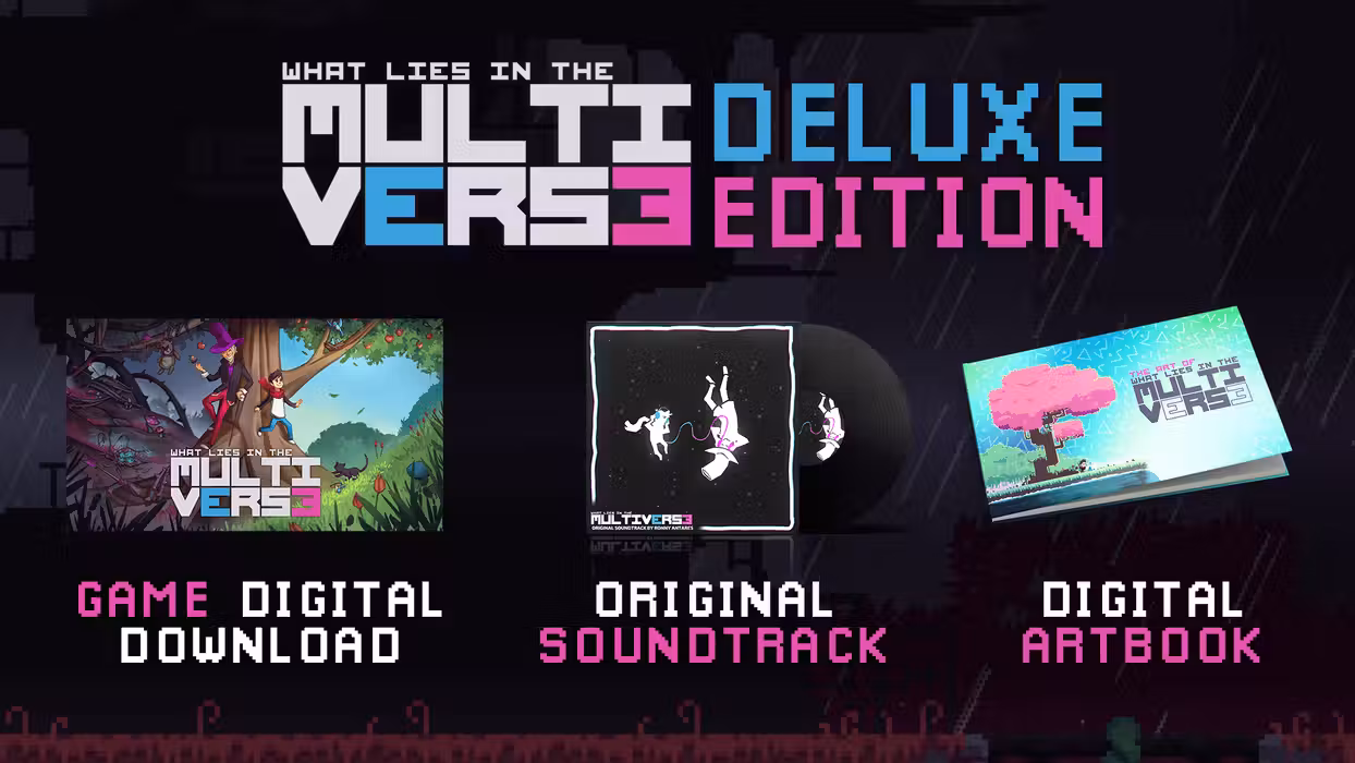 What Lies in the Multiverse - Deluxe Edition includes the base game as well as the full original soundtrack complete with all 55 original songs from the game. The package also comes with the digital artbook, where you can gain a deeper look into the creation of the game by the talented teams from Studio Voyager and IguanaBee.