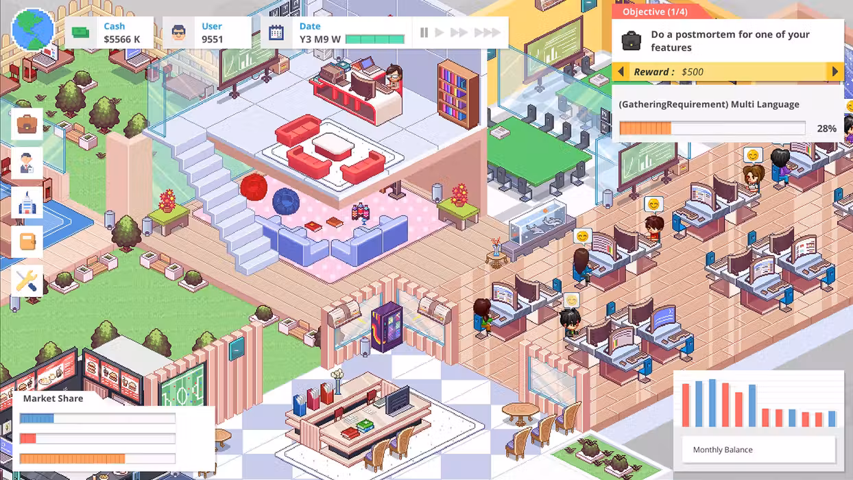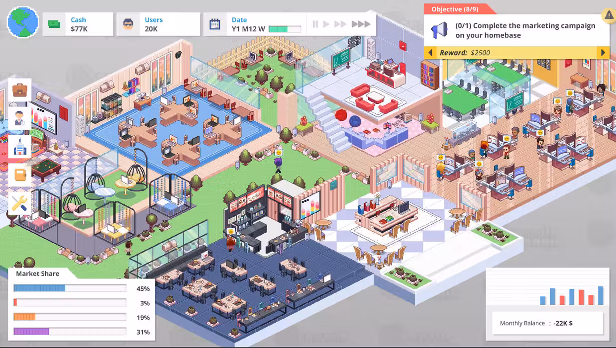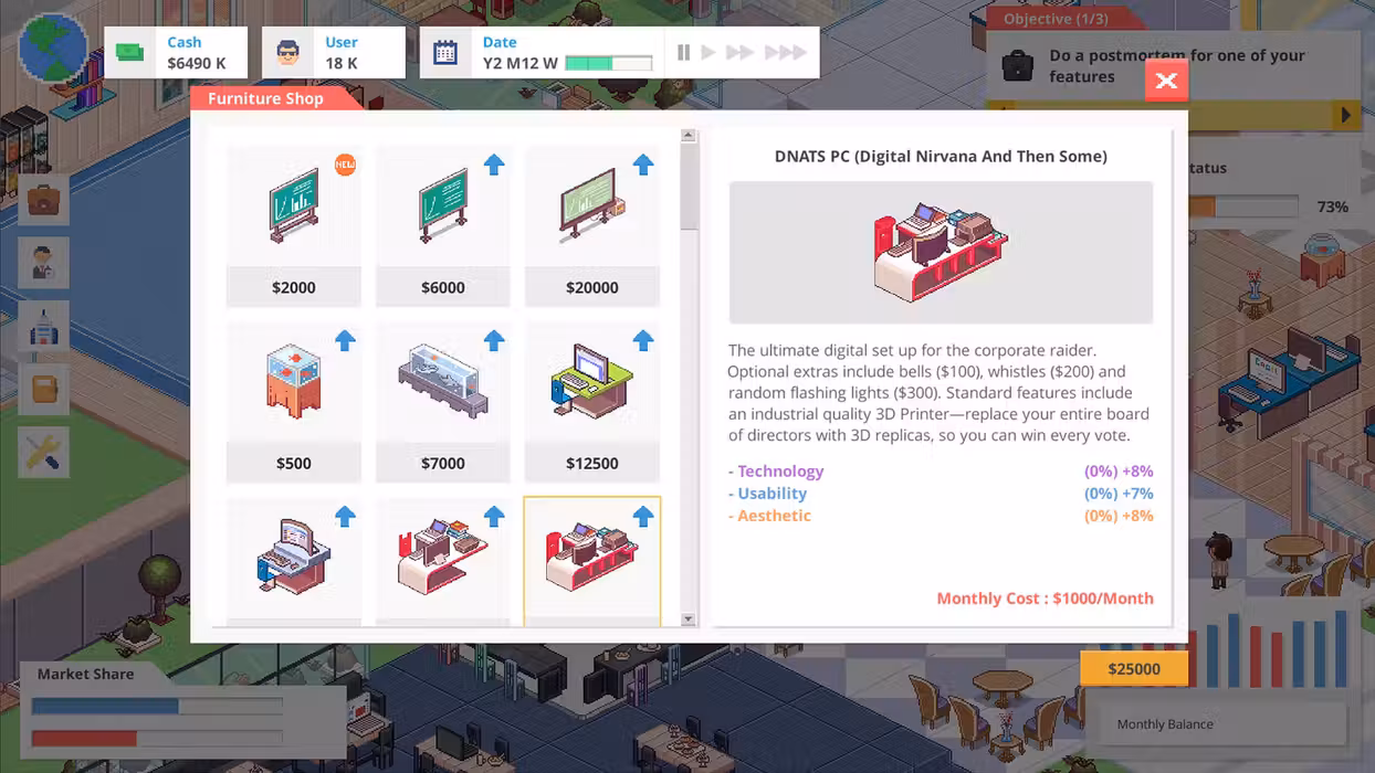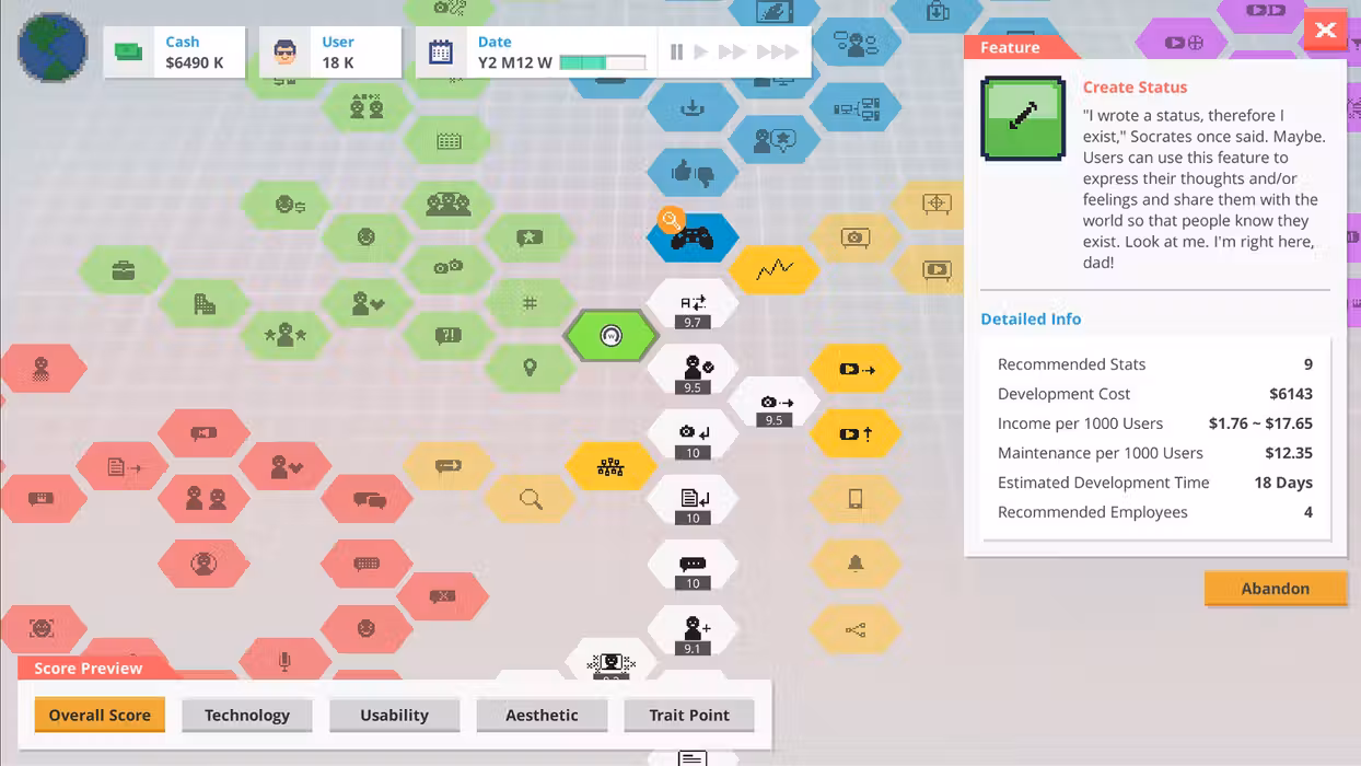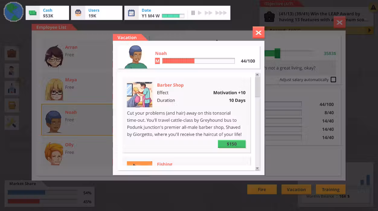 - Spend a week training your staff, or earning money, or building features... but choose wisely!