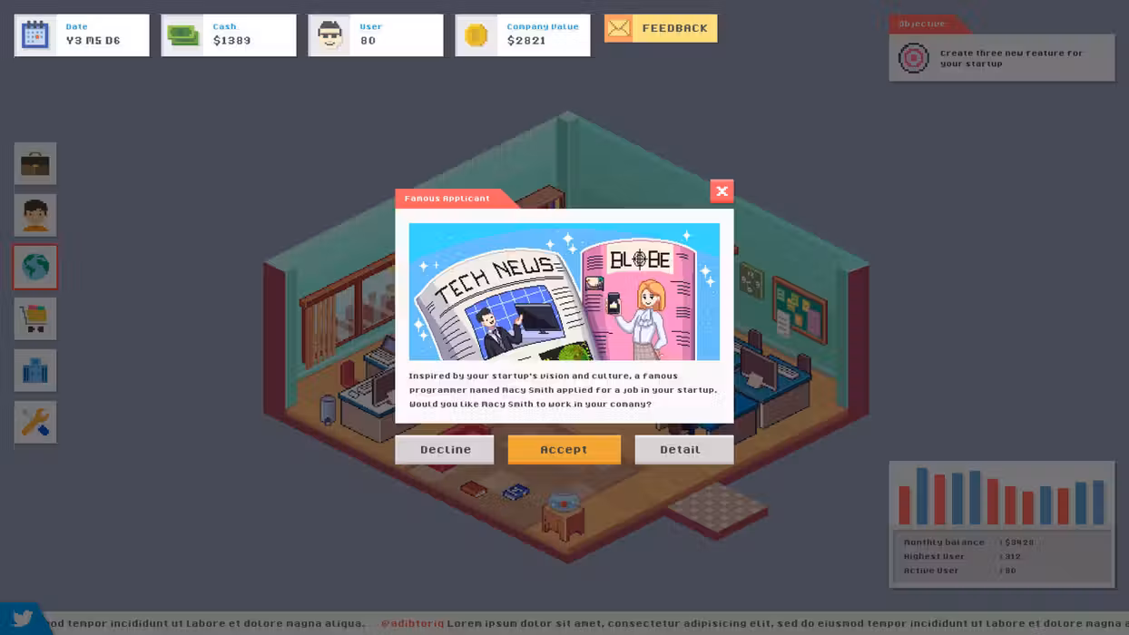 - Compete with rival CEOs for new users in your region, and then expand out by building new headquarters on a world map!