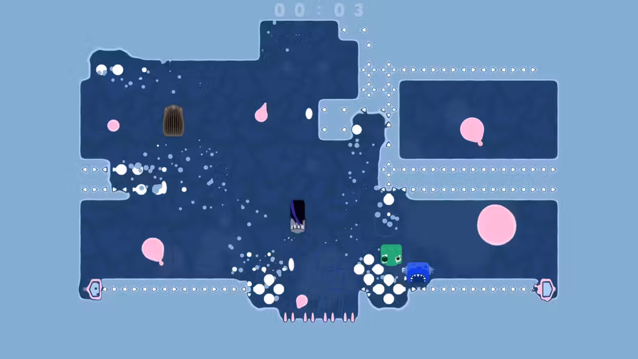 Spitlings is a multiplayer game that takes cooperation seriously:If one player fails, everyone restarts the level together.