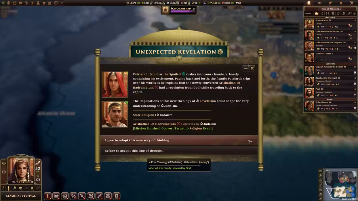 Old World - The Sacred and The Profane adds a touch of religious fervor to your play with a wealth of new content that explores how religion impacted the fortunes of ancient empires. Experience over 350 new events, recruit new historical characters, and deal with the demands of the clergy as you try and appease the various faiths that exist within your empire. Be warned, if a religion disapproves of your rule, it can lead to dissent, riots, or worse. Old World - The Sacred and The Profane includes: • 350+ new events - from small rituals and everyday belief, to the power struggles of state religions and the emergence of world religions, you’ll need to keep your wits about you to navigate the complex world of ancient worship. • Clergy characters - these new characters can join your court and bring their own missions and projects. How much they benefit you depend on how well their religion likes you. Existing characters can be inducted into the Clergy through a mission by the state religion's leader. • Over 10 new character traits - The Sacred and The Profane adds a variety of new character traits, including new core traits, event-related traits, and traits unique to Clergy characters. • Six new historical characters: • Mani, the founder on Manichaeism • Paul, fiery Christian convert and early Bishop • Josephus, Jewish rebel, general, and scholar • Ostanes, one of the rumored great magic users • Sappho, Greek poetess • Hypatia, Alexandrian scientist and philosopher • Religious dissent mechanics - Negative opinion from a religion can lead to dissent in cities with that religion, which can have lasting consequences. • Over 10 new ‘cult’ city projects - There are new cult improvements added by events, as well as improvements for existing Shrines. Each has a powerful and unique effect. This DLC pack features a lot of 'what ifs', reflecting a time during which many religions were young and the empires of the known world were forced to reckon with competing faiths old and new.