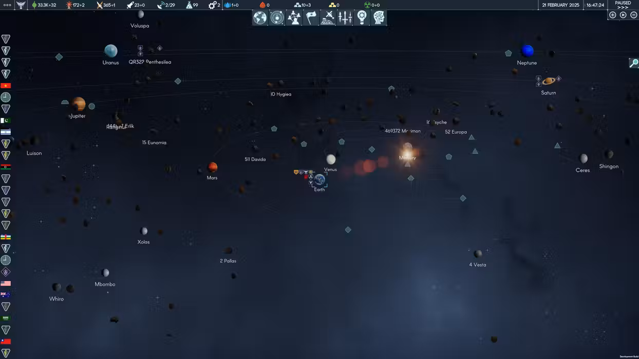 The current build is already the complete game for all 7 factions. The goal of Early Access will be to continue to refine and polish the simulation of geopolitics and Solar System exploration, deepen the strategic experience and strength of the AI, and generally fix issues and bugs. We plan to add some content, but the vast majority of the game is already available.