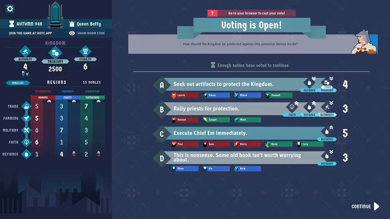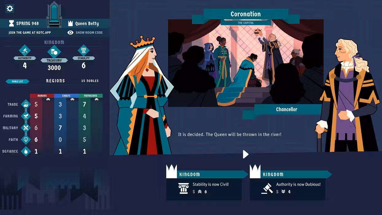 - Make your choices carefully in your role as Monarch. All your decisions are subject to the votes of backstabbing Nobles and can have far-reaching consequences.