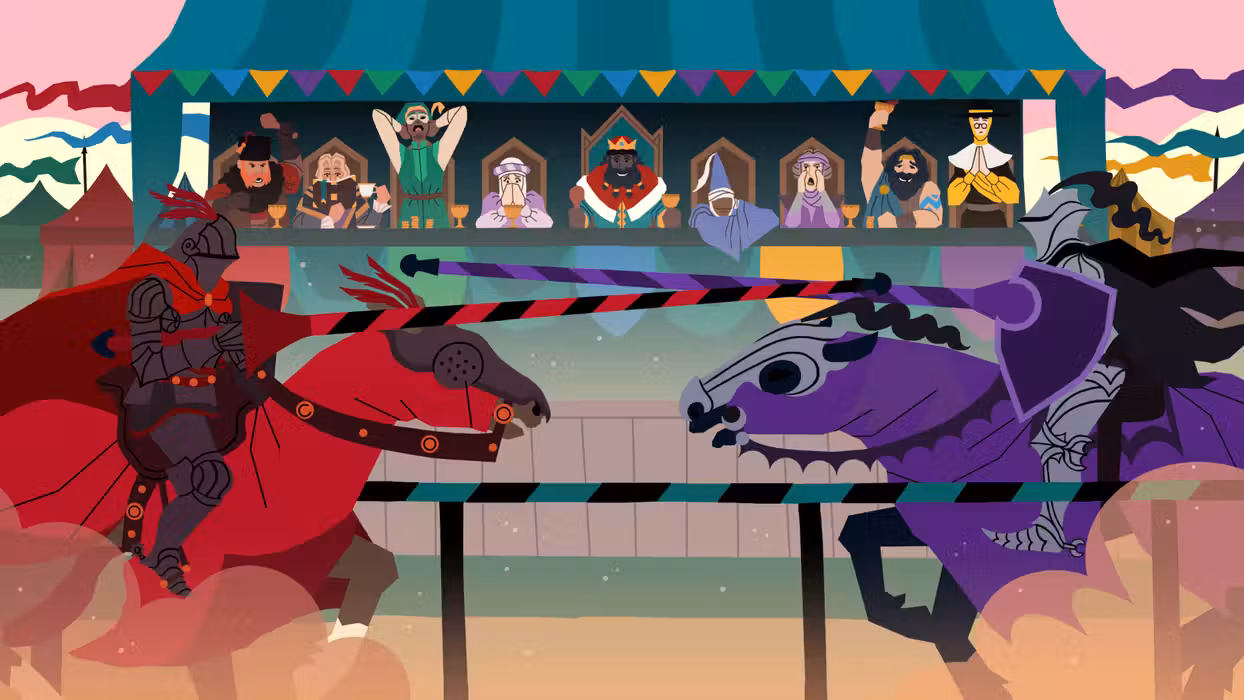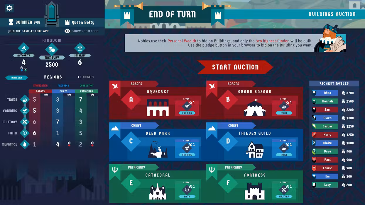 In this medieval party game, lead your kingdom to a Golden Age... or complete disaster! Join your friends to take on quests and navigate a hilarious world of politics, treachery, and even all-out rebellion as your decisions see your empire flourish or come crashing to your feet. King of the Castle is a multiplayer party game of shifting power dynamics and intrigue for players of all ages. Games can be joined using a computer or mobile device. Play With Friends 3 to 24 players can join as your 'loyal' Nobles and play directly through their web browser. Plot regicide (and worse) with your friends across over 800 Events and 20,000 unique choices, each storyline featuring them as central characters in this Game of Phones. Rule Wisely - Make your choices carefully in your role as Monarch. All your decisions are subject to the votes of backstabbing Nobles and can have far-reaching consequences. - Balance the competing demands of the different regions of your Kingdom โ€“ each with its own desires, difficulties, and ongoing plots. - Bribe, persuade or intimidate your way through difficult votes that threaten not to go your way, or try to alter the law itself to give yourself extra power. Make History - Forge the unique history of your realm. As the years pass, your Kingdom will change according to your decisions and different regions will rise to power. - Customize your Kingdom. The Monarch and Nobles can choose their own name, appearance, pronouns, and shields. - Nobles getting a bit too uppity? Execute any who stand in your way but look out for heirs who might seek revenge... Beware Treachery - Foil the plots of treacherous Nobles as they pursue their schemes to depose you. - Tax those that get on your nerves and watch the gold (and salt) pile up! - Watch your back โ€“ if Defiance gets too high, your Nobles can revolt in a bloody civil war that might tear your Kingdom apart! Look Majestic - Personalize your Monarch or Noble with a dizzying array of clothes and customizations. - Unique customized characters will stand out in larger games and will be picked for starring roles in the story! Stream on Twitch King of the Castle is fully Twitch-integrated! Streamers can play as the Monarch and - with a simple โ€œ!joinโ€ command in chat - their Council can be joined by up to 3000 Nobles, using chat commands to influence the story of the Kingdom.