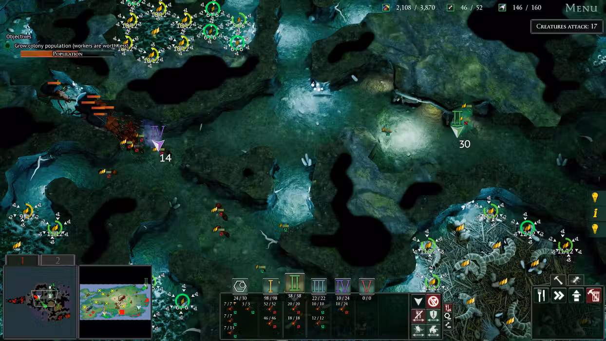 About the Game Set in the world of ants, Empires of the Undergrowth is a real-time strategy with extensive nest building and management features: Control armies of ants in battle against rival colonies, dangerous insects and other critters while autonomous workers respond to your high-level commands to maintain nest operations below ground. Excavate and construct a nest to your design Command your worker ants to excavate the earth to your exact specifications. Eggs and food need to flow freely throughout the nest, and soldiers should be able to reach the front lines quickly, so planning out highways and connecting corridors is key to overall colony efficiency. Command your army with pheromone markers Ants can be assigned to groups and controlled by placing pheromone markers: They head towards their marker gathering resources or fighting enemies they meet along the way. You can also assign specific behaviours to your groups. For example, passive workers can collect food even when enemies are nearby, while specialised soldiers can be instructed to ignore food, running straight toward battle. Toggling behaviours efficiently can reduce losses, speed up victory and ultimately turn the tide of battle against a superior foe in your favour. Battle against opposing colonies, huge insects and other critters Lots of ant species from all over the world feature in the game with stats and abilities based upon their real-world counterparts. For example, wood ants can spray formic acid from their abdomens, making them the artillery of this miniature battlefield. Enemies need to be kept at bay with hordes of disposable melee soldiers to prevent the delicate sprayers being overwhelmed in close quarters combat. It's even got two minimaps - wow! Both the underground nest and the outworld are filled with food and enemies – you can see both at a glance with dual minimaps. When invading enemy nests, minimap tabs give you access to view multiple underground zones so you can run several raids at the same time and keep track of everything. In the example above there are two enemy colonies nearby!