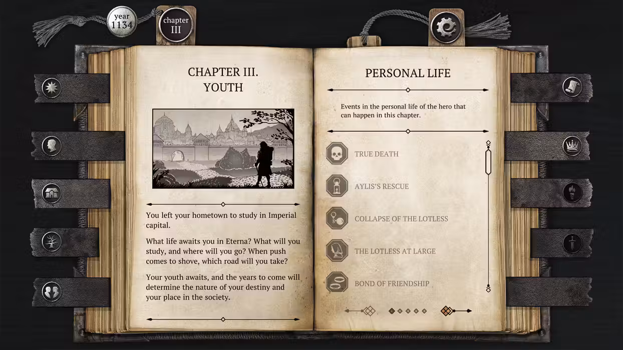 Life in the Great Arknian Empire is harsh and its hardest Lot is yours by the circumstance of birth. You are a commoner, holding no rights and no title. To seize your fate and become the rightful heir to the legacy of the Brante family you will have to come to grips with ossified tradition and prejudice. Embarking on a life-long journey from one's birth until true death, you will have to endure great upheavals, face adversity, and make many difficult choices. Every decision will affect not only the protagonist, his family, and loved ones, but may even topple the foundation of the Empire itself.