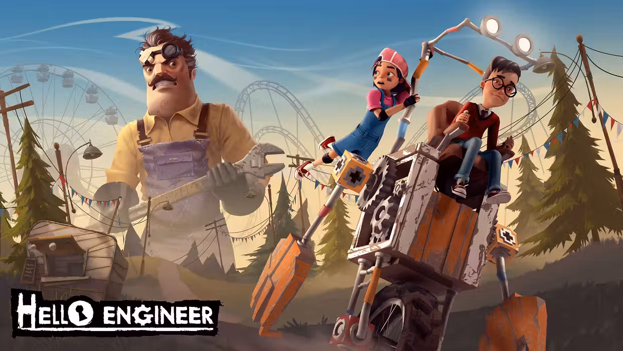 Hello Engineer is a multiplayer machinery-construction game set in the Hello Neighbor universe for up to 4 players! Scavenge, craft, and overcome challenges in the bizarre world of a mysterious amusement park. Put together incredible machines built of scrap, and challenge your creepy Neighbor and his evil bots. Roll, fly or bounce your way to victory; any machine that gets the job done is a successful design!