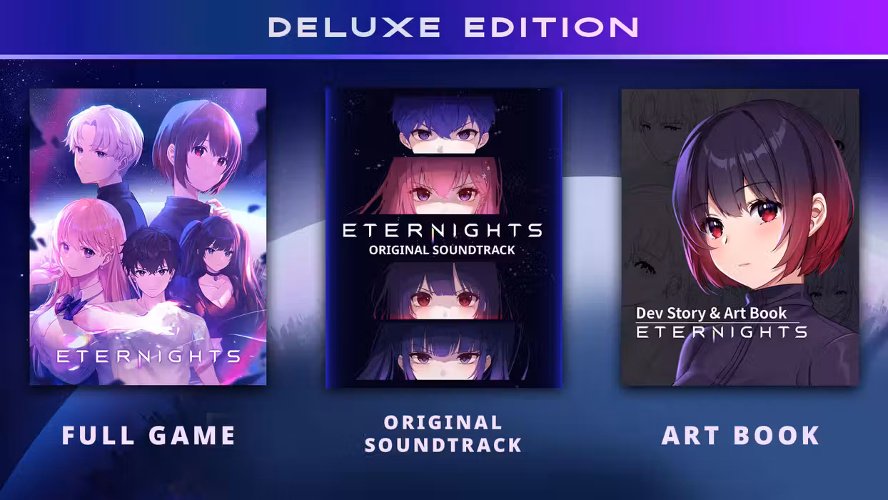 Immerse yourself into the world of Eternights with the Deluxe Edition, including the base game, the official digital artbook, revealing insights into the development of Eternights, and the official digital soundtrack featuring over 100 tracks composed by Spencer Bambrick. Eternights is a unique blend of dating and action where players can explore a post-apocalyptic world filled with danger, love, and adventure. Save the world, and find love along the way. Face the infected One day, something, or someone, has turned humans into dangerous monsters. All that interests them now is violence and power. They are what stand between you, a cure, and the world you want. Most importantly? You’re fighting for more than just your own survival – you are fighting for those you love. Find Love The impending end of the world makes for a great conversation starter! When you’re not exploring dungeons, you can choose to spend time growing closer to a cast of five quirky and loveable characters. Explore their stories and grow closer to them to unlock unique skills and spells you can use in battle. Race the Clock Scavenging, dungeon crawling, dating…there are just too many things to do in one day, and each area has a deadline! Will you grow closer to your confidant in order to deepen your relationship and unlock new skills? Will you scavenge the wasteland for supplies? Will you grow stronger by training with your companions? Or will you ignore all of that and go to the dungeon the first chance you get? It’s up to you, but remember, the clock is ticking. Explore Dungeons These dangerous areas - known as the Wall - are filled with mystery and danger. As the deadline looms, you will have to quickly overcome traps, puzzles, and dancing minigames to make it through in time. Luckily, you have your confidants by your side to help when things get scary. Animated Cutscenes There are several fully 2D animated cutscenes that change depending on who you decide to date. Immerse yourself and truly connect with the characters you are spending time with.