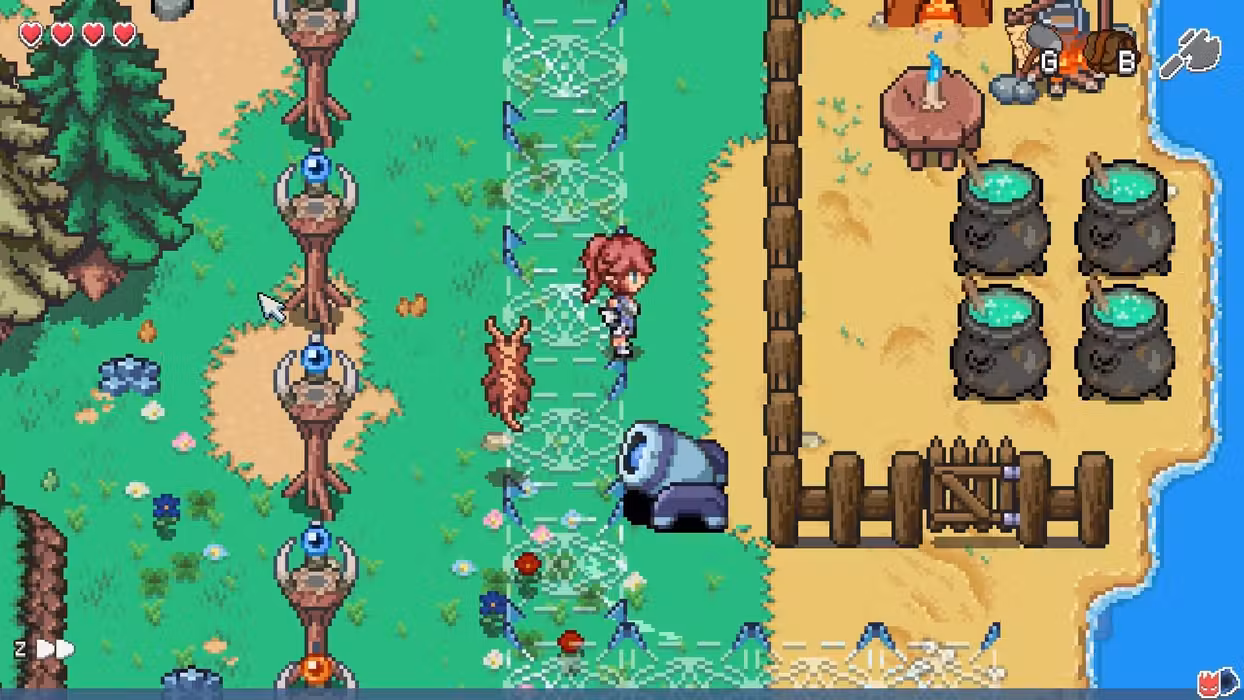 • Each wave, eventually, peters out. Use the lull in combat to fix up the base - or venture out, explore, fix bridges, and scavenge the derelict Kingdom.
