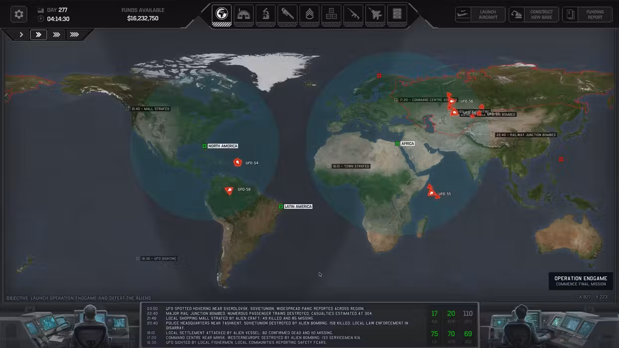 - Scramble jets to respond to UFO sightings, engaging them in real-time tactical battles that put you in command of your fighter wings. Tell your pilots how to maneuver and who to target, ensuring their victory while also keeping an eye on their fuel gauge and the proximity of your nearby hangers. No forced 1-1 duals here – if the aliens bring a technologically advanced and heavily armed space craft to the fight, gang up and send a whole squadron of your best planes to bring it down. The strategic layer and air battles are closely intertwined, and your careful planning of your global network of bases is of the utmost importance.