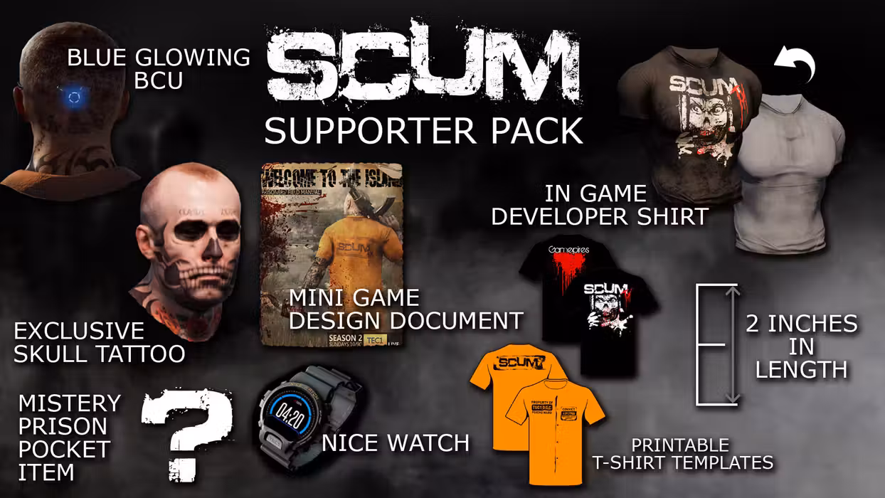ITEMS INCLUDED IN THIS BUNDLE: -SCUM (Base Game) -SCUM Supporter Pack -SCUM Supporter Pack 2