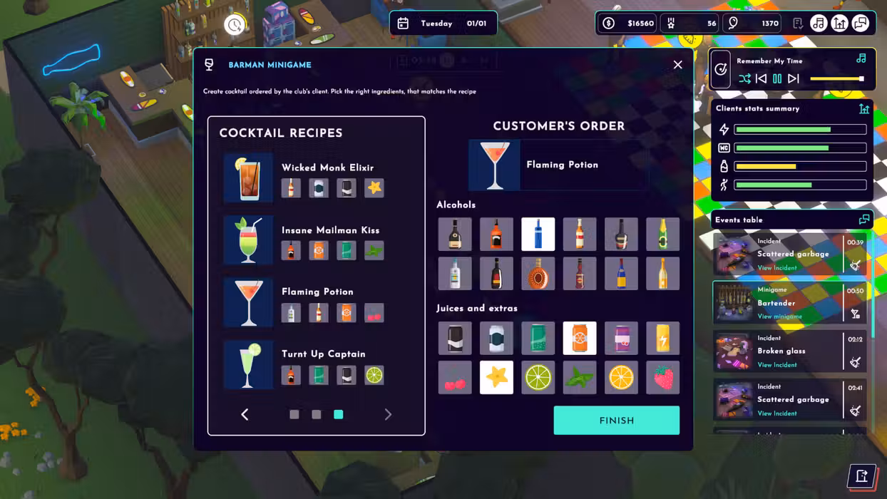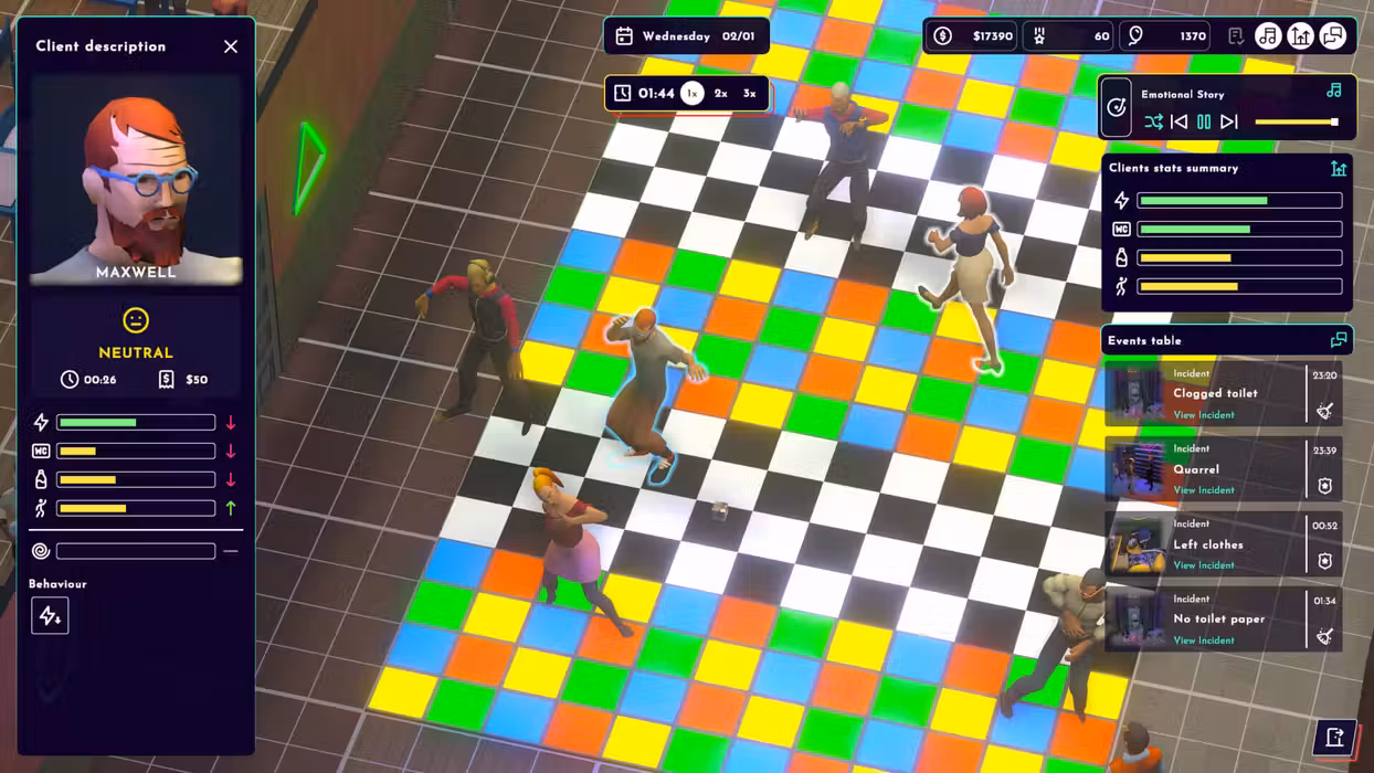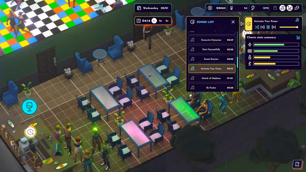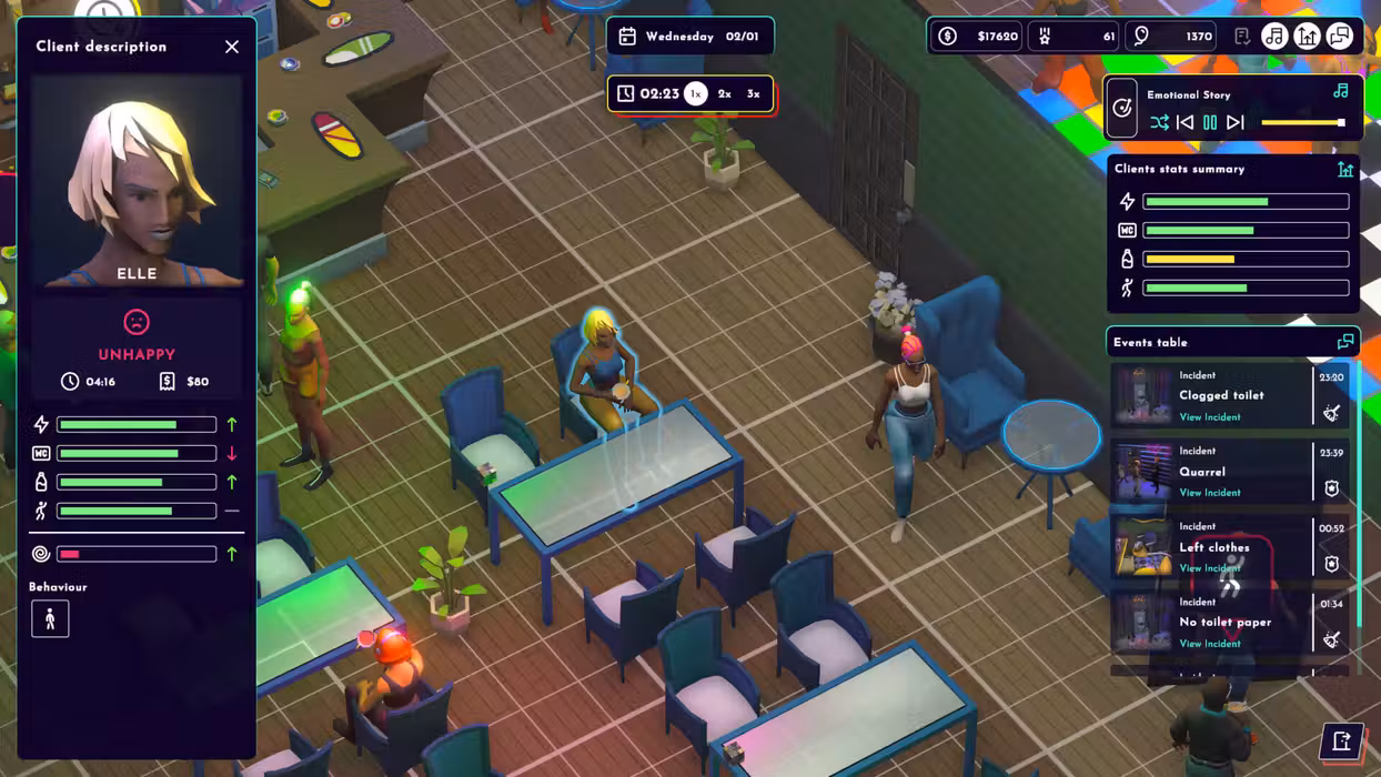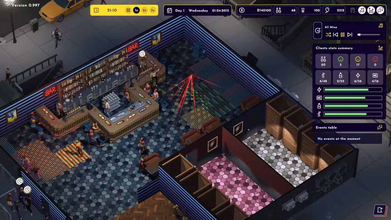 Your success depends on customer satisfaction. Every guest has their own individual needs, which you must meet in order to keep them in the club. Do they prefer elegant drinks in stylish cocktail glasses? Or maybe they want to dance to the best hits until dawn? Your job will be to make sure that the music, atmosphere and service meet their expectations. Take care of your customers and thanks to this they will recommend your club to others, thus increasing your reputation. React to unexpected events - spilled alcohol, a clogged toilet or a drunk customer, you will have your hands full!