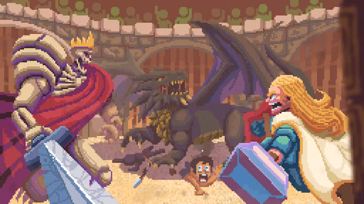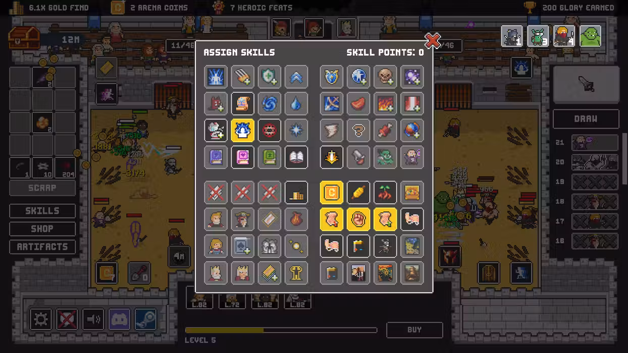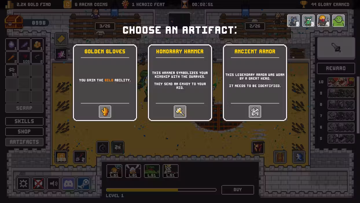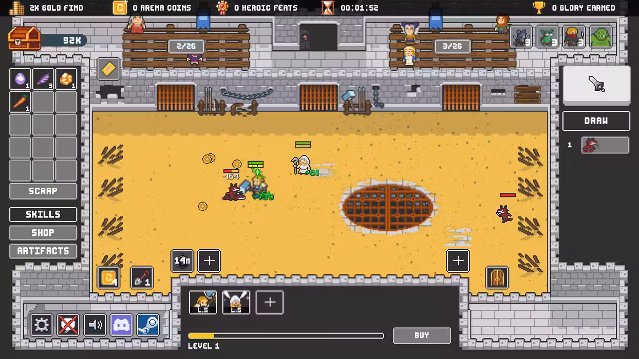 Your team of four heroes starts out weak, as expected, but develops quickly, unlocking endless customization options. Every monster drops gold, spent on unlocking levels, skill tree branches, new classes reflecting your playstyle, new enemies to face, new cards to experiment with… Every unlock brings with it new ways to play the game and prepare your heroes for meeting the final challenge! Everything you do between bouts of heroically bloody fighting in the arena matters. Your heroes earn you Glory. You can then spend Glory to get more heroes to throw into the meat grinder, unlock new spells, cards, and change the dynamic of the game. Then, it’s back to the arena for them to fight (or, if you're daring, dig up artifacts while under fire). Victory or death! Quite literally, actually: Fail to manage your heroes properly and face utter defeat and humiliation! Play your own way, combining classes, party compositions, factions, skills, and decks for an endless variety of playthroughs. And if you fail? Lather, rinse, and repeat, with a different roster of heroes and an entirely unique set of challenges tailored to them and their party. Are you ready to take on the challenge of the Clicker Arena and emerge victorious?