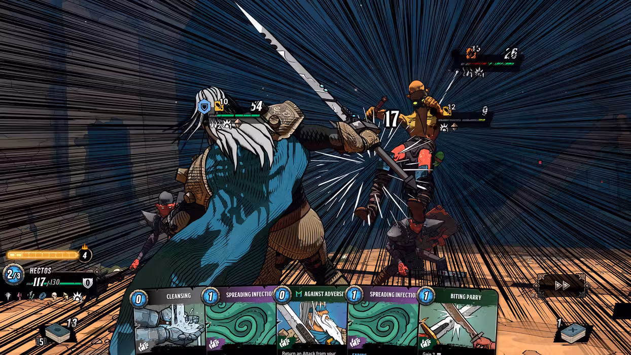 Choose your hero. Choose your companion. Choose your cards. Dive into Oresa and face its many perils in fast-paced missions. Beneath Oresa is a fighting roguelike deckbuilder. Deep within the city, confront your foes in real tactical arenas. As a strategist, choose your cards, upgrades, and artifacts wisely, but as a fighter, keep your distances with your foes, engage them at the right moment and turn their positioning to your advantage. With several factions, many heroes with unique abilities, daily missions, unique game mechanics and more, this furious combination of roguelike and tactics elements will lead you deep beneath Oresa. Each time you dive into the depths, you choose a second hero to accompany you. As a companion, each hero brings eight unique powers. With dozens of possible duos you can develop your own playstyle or try improbable duos. Do you need an expert against boss fights or a proto-blacksmith that enhances your card upgrades? Position on the battlefield has never been more important! Line up enemies for super attacks, move to a different zone to avoid being hit, or position enemies to knock into each other. Cards don’t just get better. Each card upgrade comes with a difficult strategic choice between two upgrades. Choose wisely, depending on your deck and playstyle. A powerful bonus but only for the round? Or the same bonus but for the whole fight? Two different paths...