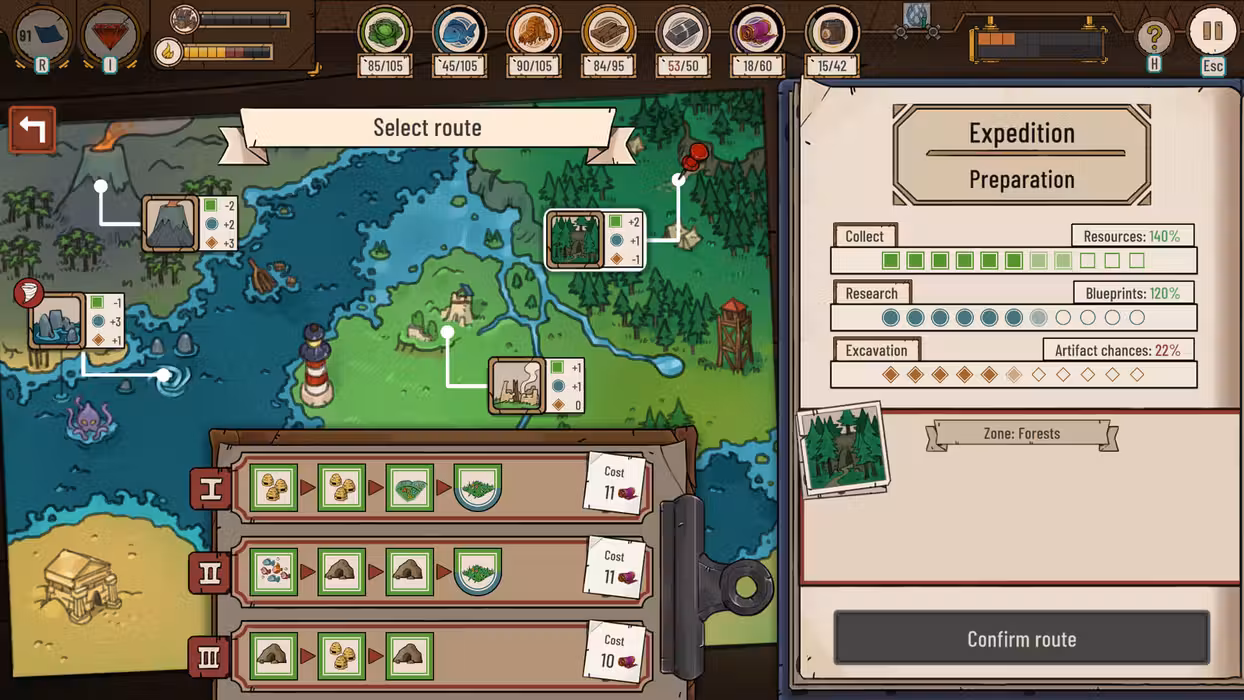 The keeper and his cousin reunited. With the latter's flying machine, it is now possible to go on an expedition. Choose a route on your map, and assign your most dauntless travelers to explore the surroundings. Be cautious, as each area, route, and crew member will influence your expedition's success.