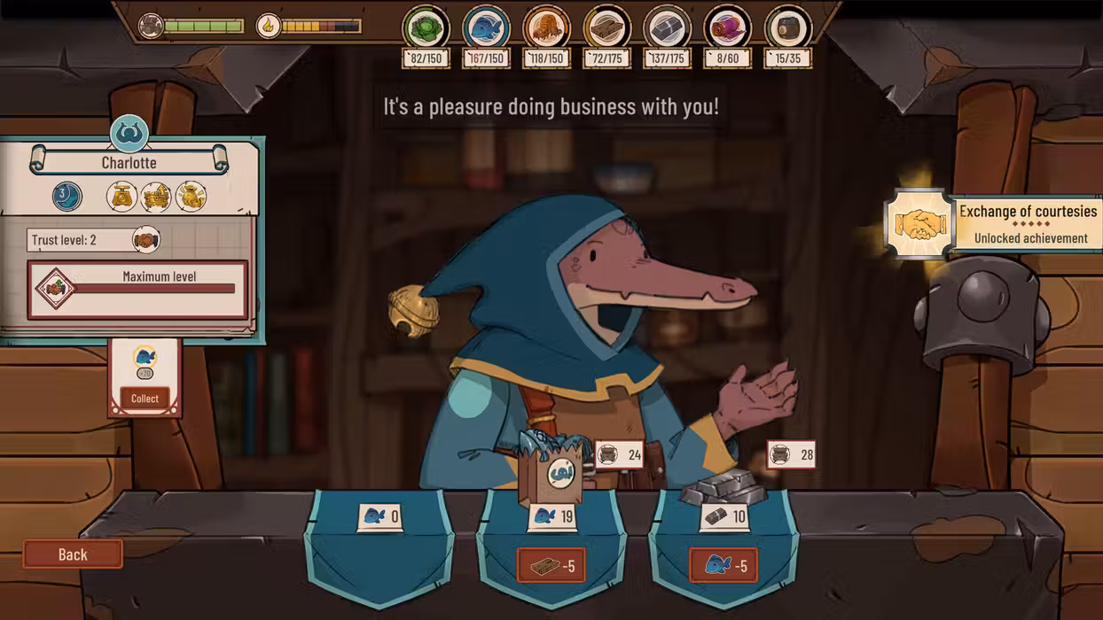 Numerous people cross the Diluvian seas, and the lighthouse is the perfect meeting point for merchants seeking resources. Trade with them, and maintain a trustful relationship with their guilds to increase the number of services they offer.