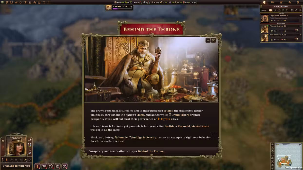 Old World - Behind the Throne introduces the machinations of the royal court with new mechanics, rivalries, and the ability to leverage your power with opulence projects that bring you closer to victory. New historical characters take center stage in the role of advisors, viziers, aristocrats, and courtiers. These rising stars bring their own ambitions, desires, and drives with them. Will Alcibiades change his allegiances multiple times throughout his life or will you be able to put an end to his double-dealing antics? Will you let Enlil-nadin-sumi successfully usurp the throne of Babylon? Or will Harpagus betray your ruler after a long life of service? Let others manage your cities and befriend them, or watch as they turn into dangerous rivals fueled by a thirst for power. Old World - Behind the Throne includes: - 350+ new events centering around court politics, intrigue, and personal ambition. The world behind the throne is a complex web of deceit, personal goals, and opportunities. - New historical characters - Alcibiades, Athenian statesman, and notorious political double-crosser. - Enlil-nadin-shumi, usurper of the throne of Babylon. - Harpagus, Kingmaker of Akkad. - Bardaisan, scientist, scholar, and philosopher of Assyria. - Mago the Author, Carthaginian writer on agriculture. - Avicenna, famed philosopher from Persia. - New projects and improvements - Estates, expensive new, improvements with a wide variety of benefits. - Opulence, a new project made possible by Estates. Use your wealth to generate additional victory points. - Slums, which balance faster population growth with risk of rebellion. - New Gameplay mechanics - Rising Stars - Powerful non-leader characters who present dangers and opportunities as they accumulate experience, triggering a wide range of events with both negative and positive effects. If they become too much of a nuisance, there’s always ways of “dealing” with them. - Stress & Revelry - Stymied ambitions, jealous lovers, raging barbarians, and much more can all take their toll on a ruler. Will your ruler take the path of revelry to escape the stress? - The Grand Vizier - Take the minutiae of managing your cities off your plate, handing control to Viziers who will manage based on their personalities. Wise Viziers will focus on culture, courageous ones will recruit military units faster, while disciplined ones create specialists and special projects faster. Be warned, though – power corrupts, and a trusted Vizier might turn their gaze towards your throne. - New Political Eras - Civil wars, grand reforms, and periods of corruption and decadence will bring forth new challenges for your empire as a whole.
