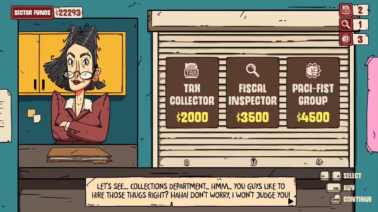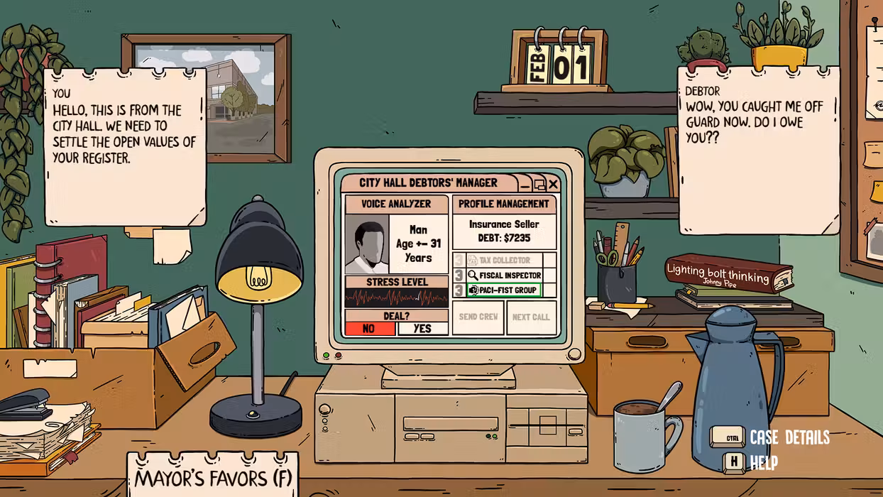 Persuade and intimidate debtors, ruthlessly interrogate their financial records, and if need be, send a couple of Paci-Fists to explain impolitely that tax dodging is frowned upon in polite society. The law, after all, is on your side - that is, as long as you can meet the daily collection quota. There's quite the backlog to work through - and precious little time.