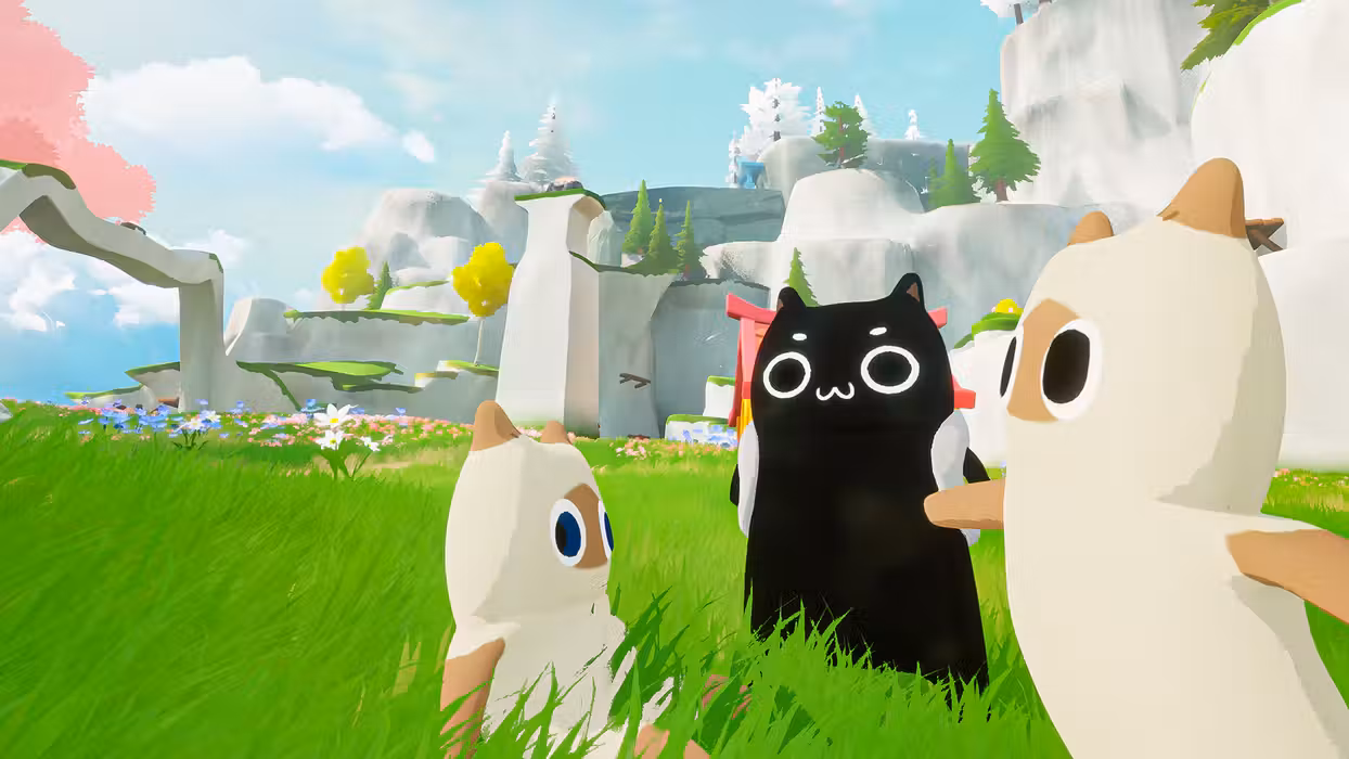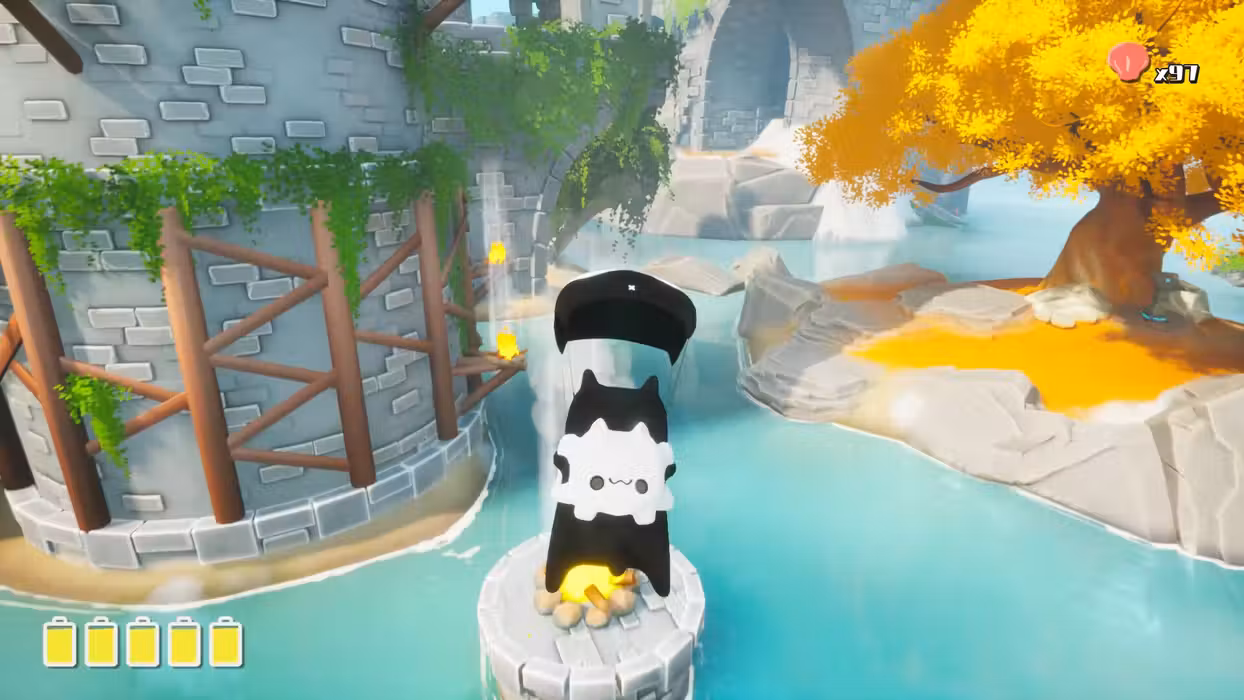 - Let's take a look at our protagonist—a little black kitty cat who's fallen from the skies and landed here, an island most mysterious. Having recovered their white cat backpack, our feline friend sets off on a journey to retrieve their lost batteries and find their way back to the rocket.