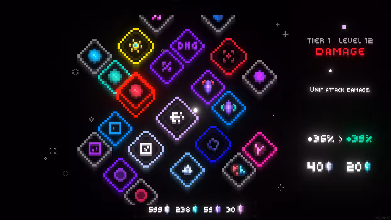 Failure is just another word for learning. With every run you gather minerals and unlock new options on the upgrade tree, allowing you to become stronger and last longer against the darkness. After all, time is not on your side: Enemies grow stronger as the seconds tick on - but so do you, gathering new resources, boosts, and upgrading your defenders to last just a bit longer.