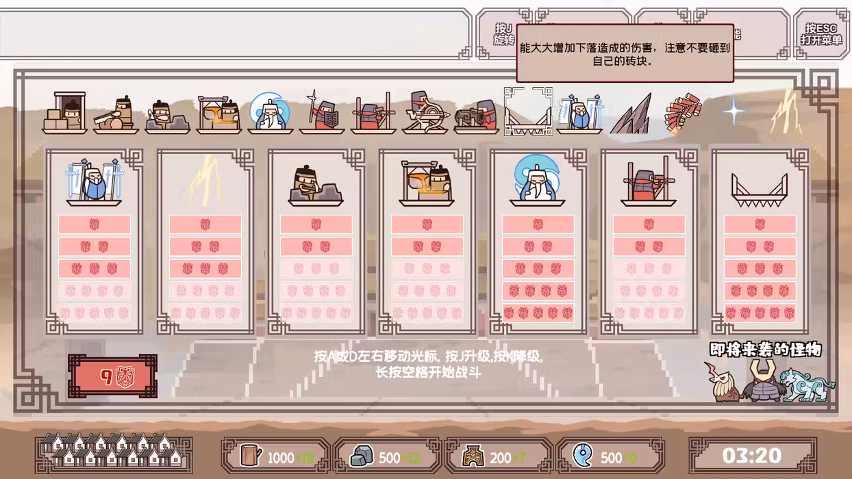 Grab this block, you can place it on the road to block monsters, or you can release it over their heads to crush them! These monsters are very cunning, some destroy the block with wild power, some Fly over the wall slinkingly, some from the underground to dig a hole to the background. Different tactics must be used against different monsters. Bricks don't just appear out of air. Look at our craftsmen, who work day and night collecting wood, stone, bronze and jade to make blocks. Wood blocks can be produced quickly, stone blocks are balanced, bronze blocks are strong and heavy, crystal blocks are fragile and deadly. With good resource management, the battle is half won. Assign your warriors to the front lines, erect shields, operate crossbows, repair holes, fire cannons. These brave warriors are honored to share your burden, so that you can better manage the larger picture. You know, the strongest wall is always the soldier's shoulder. Free the occupied areas step by step, earn the bonus shield, unlock new attachments and spells. Failure does not matter, perhaps you can change the strategy to win it back.