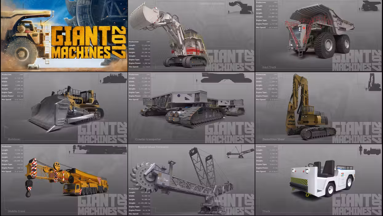 Giant Machines 2017 enables you to control seven of the biggest industrial machines ever created on Earth. They will introduce you into the world of hissing hydraulic systems, excavator buckets and the smell of diesel.