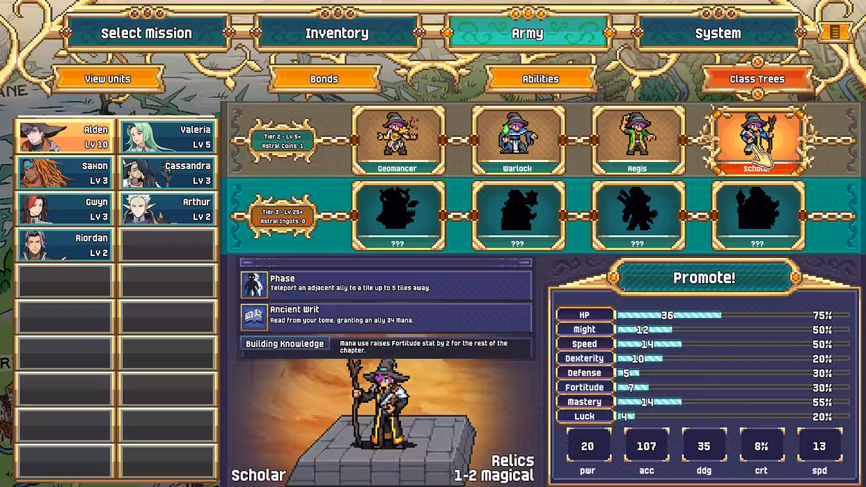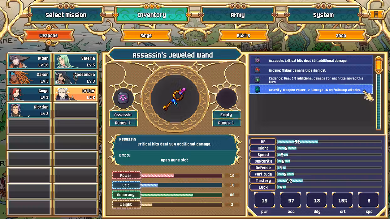 Take command of the Eternal Delegation, led by Irving’s descendants. Gwyn and Riordian will have to navigate the treacherous politics of Verroa, and weave a web of alliances to turn the tide of the coming war. Your decisions will determine the shape of these alliances and define your army. Coupled with the help of a giant pool of customizations, no two playthroughs will ever feel the same.