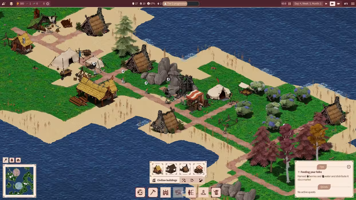 Build up and manage a settlement and care for your folks in this relaxing settlement builder with simulated citizens. You will need to provide shelter, guarantee a steady supply of food, resources and products, protect against the threats of nature. All the while paying attention to their well-being, to ensure your folks are happy, employed and safe.
