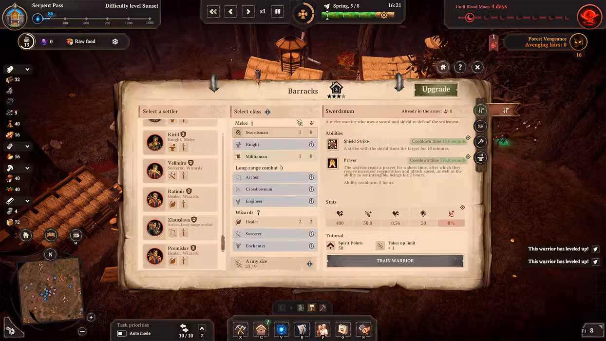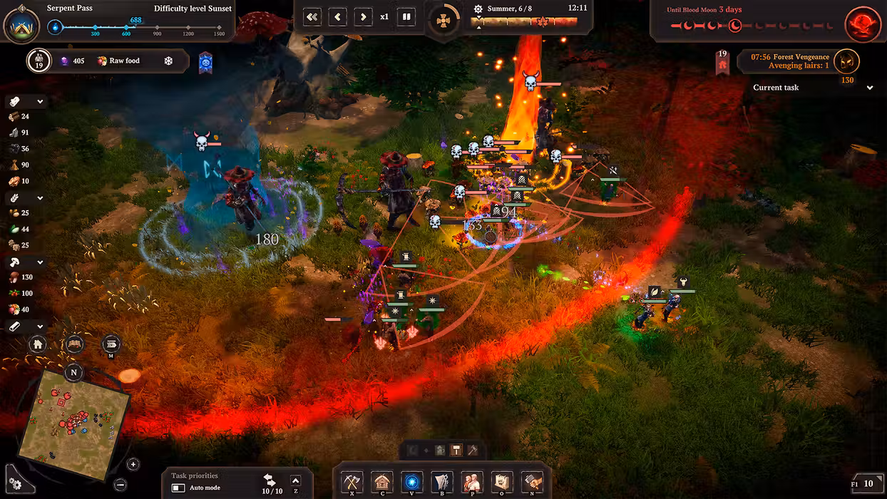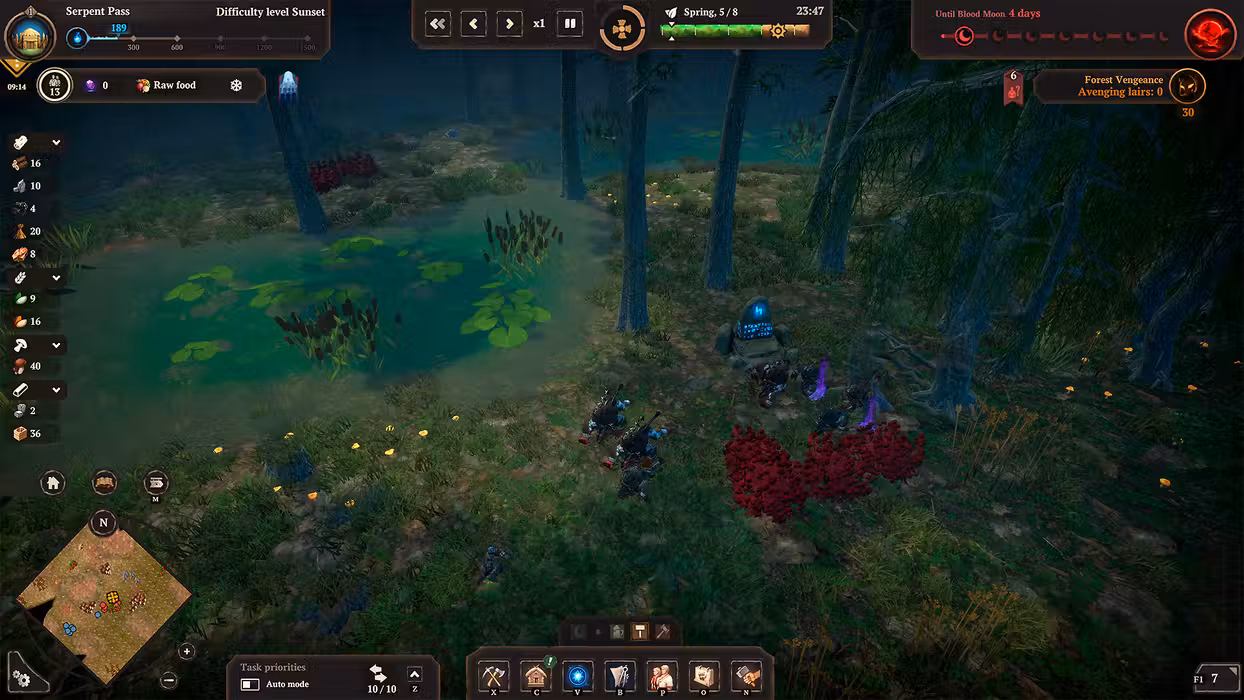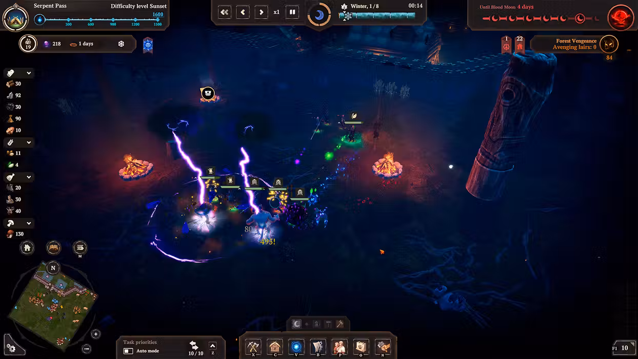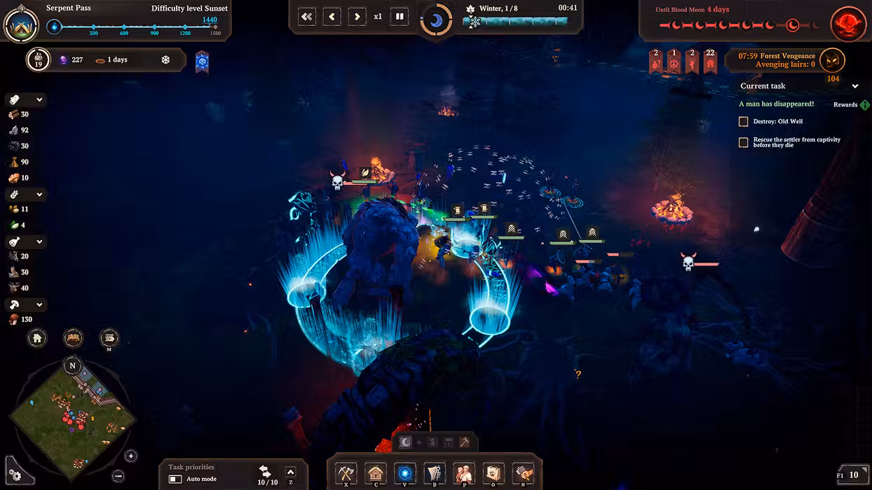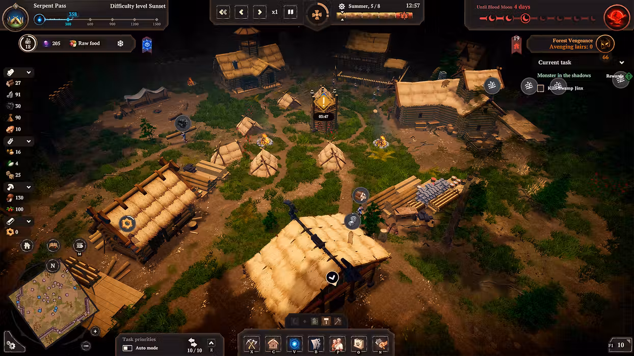 The nights grow increasingly longer and colder, but snowstorms and penetrating frost are not your only enemies... Portals open everywhere, allowing Prince Velimir's servants to hunt down the survivors. The longer you stay in one place, the stronger the Darkness grows and more ruthless the nights become: with every house built, with every lair destroyed the pressure of the woods only gets worse. Ghouls, Leshies, Werewolves, and Night Hags are only some of the creatures that will try to destroy your settlement. You'll have to defend your land against monsters and defeat their Baron so that you are able to move to new lands.