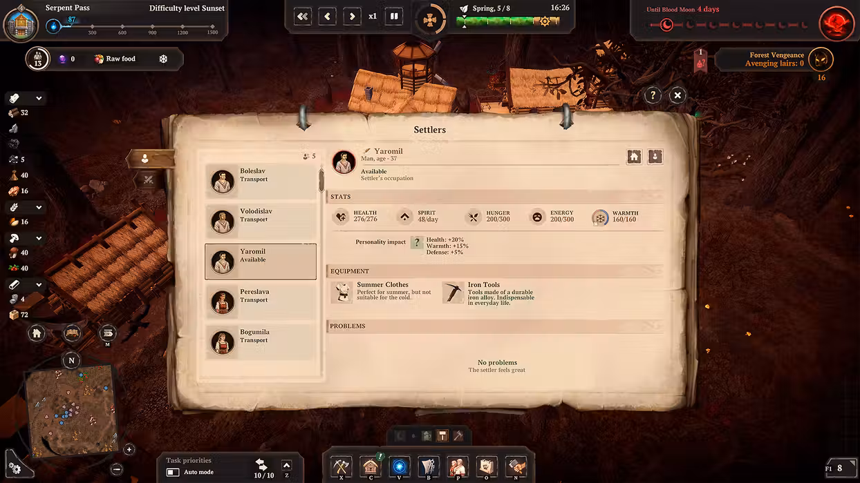 Each settler is an individual with their own attributes, needs, skills, and strengths. Govern them wisely and guide their talents towards the settlement improvement. Settlers' morale will impact their resilience and determine their capability to overcome life struggles and challenges.