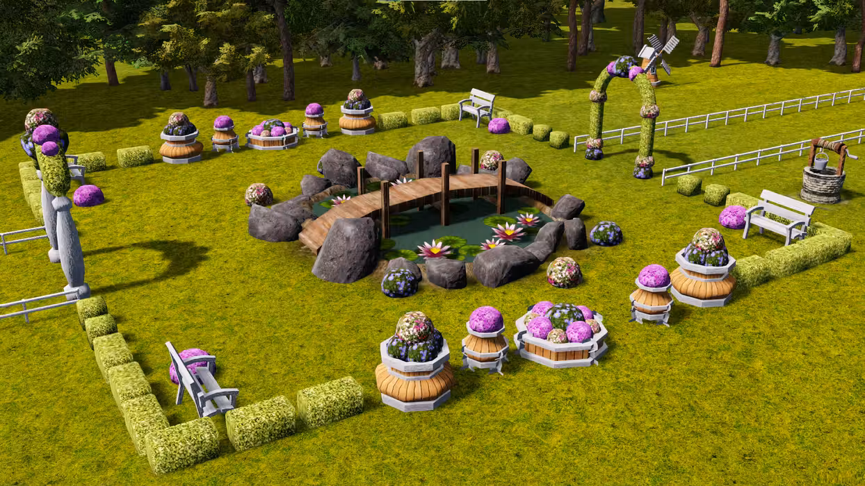 New decoration items - Fifteen decoration items (hedges, flower arches, flower pots, ornamental shrubs, a miniature windmill and a bench)