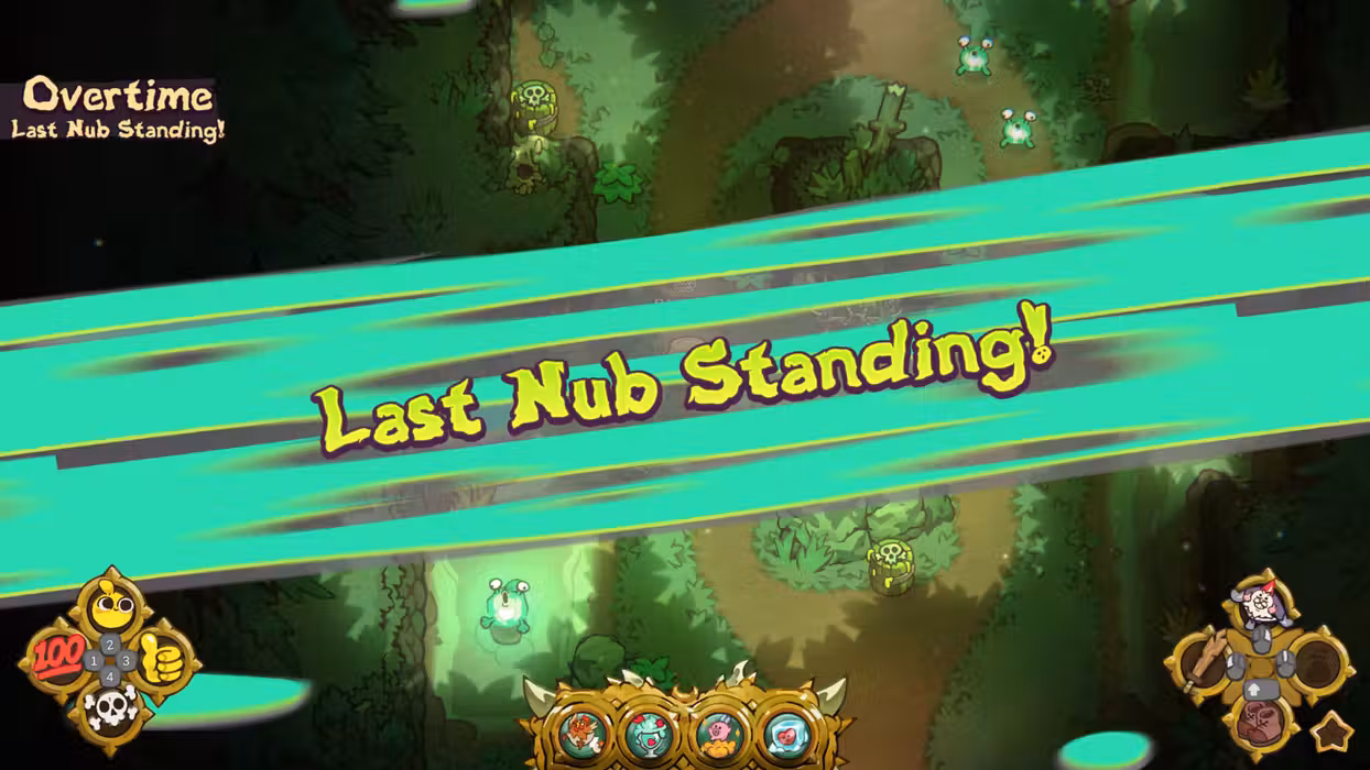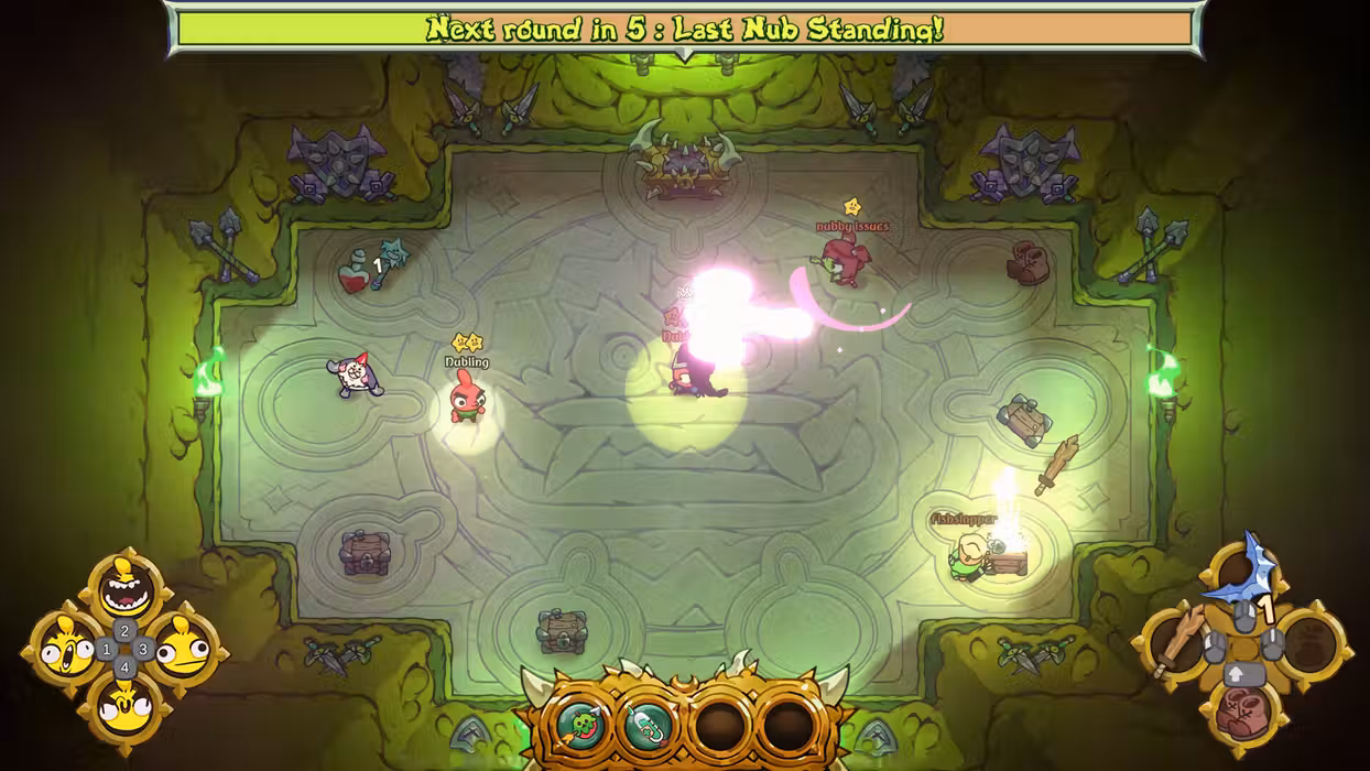 Nubs are tiny, unpredictable warriors locked in a relentless arena battle striving to be the last one standing. Online or in local couch co-op, 4 to 20 players can engage in fast-paced top-down PvP combat where quick reflexes and roguelite buffs determine the victor.
