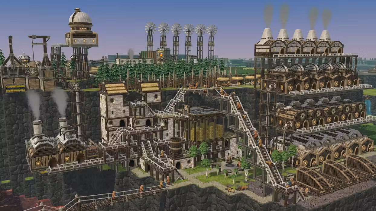 Harness the game’s unique vertical architecture system. Space is limited, so stack lodges and workshops on top of each other. Construct platforms and bridges, set up an elaborate power grid, and let your beavers speed around on ziplines or through tubeways.