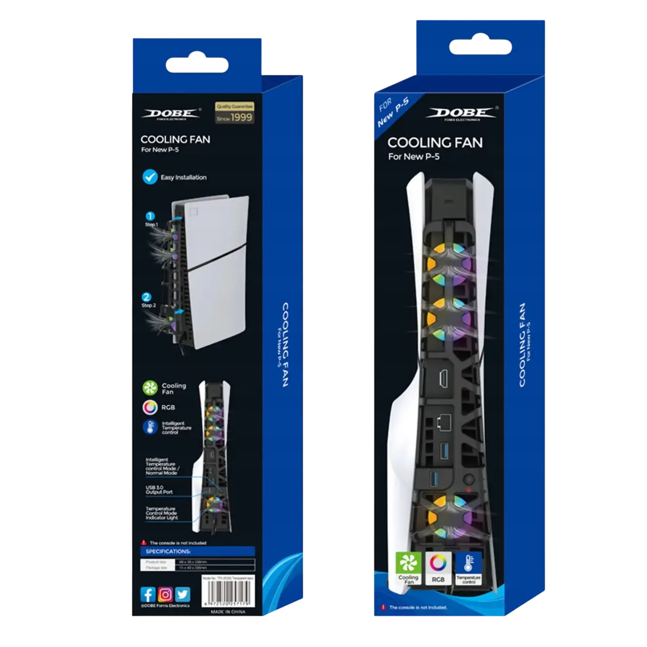 Give your PS5 Slim extra airflow with the DOBE TP5-3538S. This rear clip-on cooler uses USB 5V power, temperature-controlled auto on/off, and tasteful RGB accents to keep sessions steady and quiet.