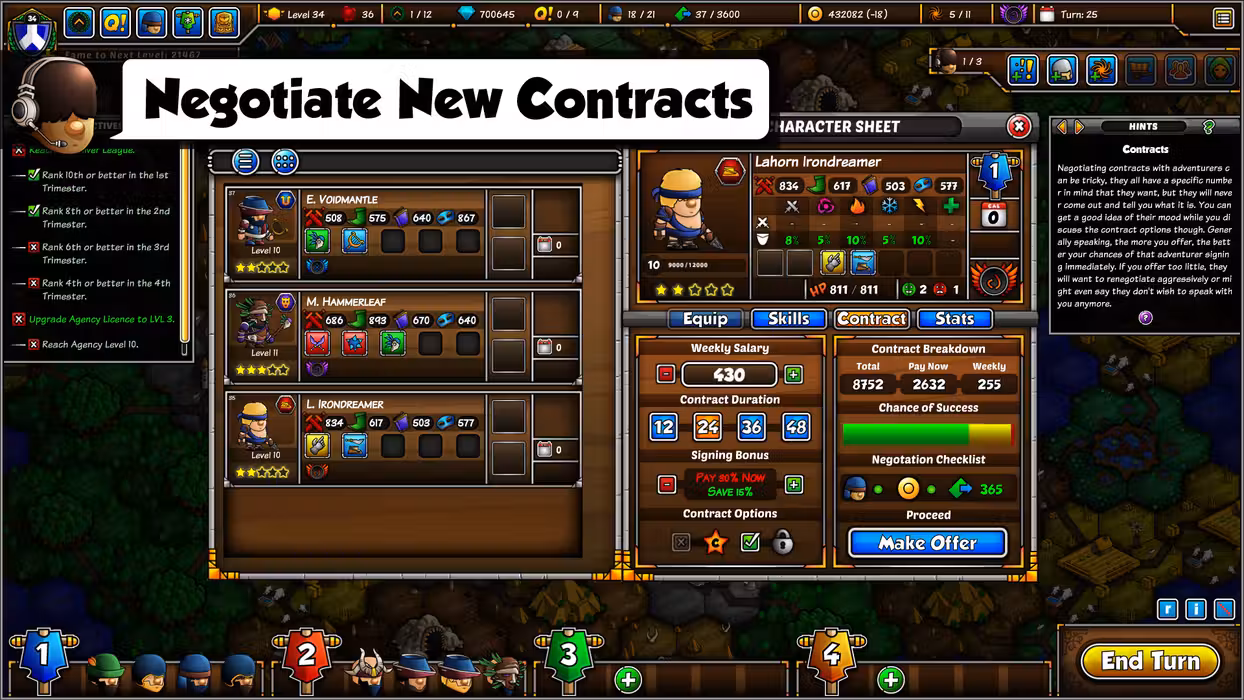 Adventurers are the backbone of your Agency. To find them, you’ll first need to organize recruitment campaigns across the Realm, then negotiate contract terms with those who present suitable talents, traits and growth potential!