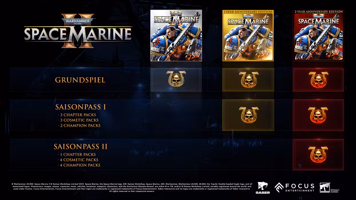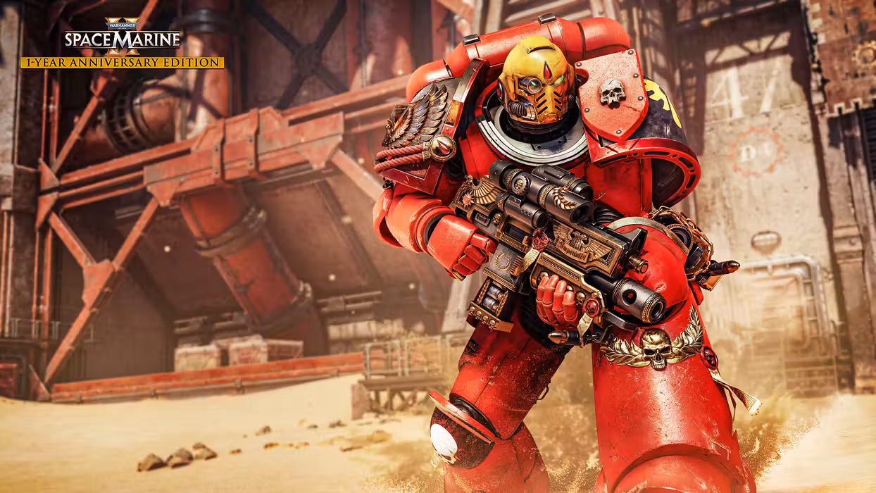 The Warhammer 40,000: Space Marine 2 Year 1 Anniversary Edition includes the base game Warhammer 40,000: Space Marine 2 and the Season Pass.