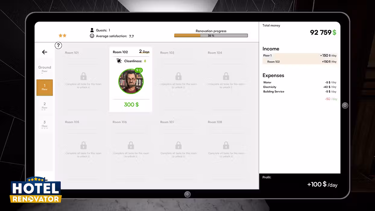 The higher the standard you maintain, the more money you earn. Invest in the amenities and attractions at your Hotel to stand out. Buy an old swimming pool or restaurant to attract more guests! Meet their needs, keep rooms tidy, and repair issues quickly. If you leave a great impression on a guest, you’ll get 5-star reviews!