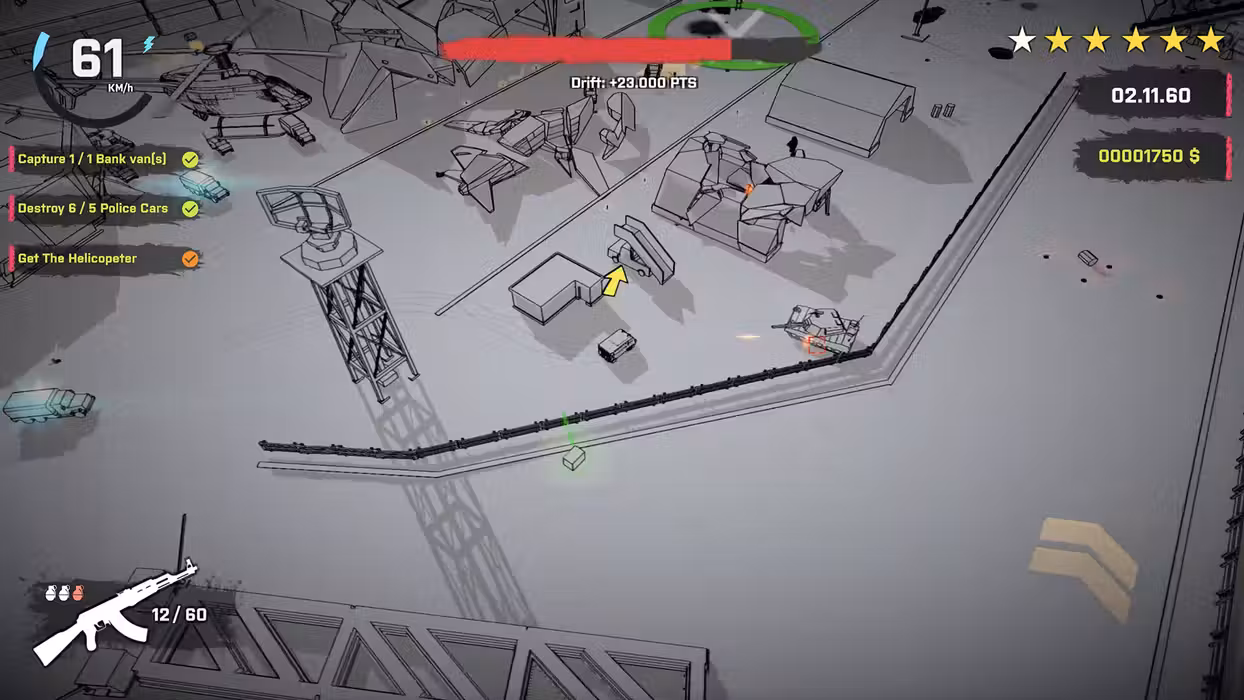Heistfest combines fast-paced arcade driving with wide-open environments and escalating pressure. The unique black-and-white visual style gives the game a striking identity, while destruction-heavy maps reward high-speed stunts and explosive tactics.