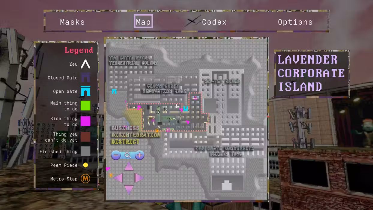 The world itself is the story. The Lavender Corporation, an evil group from the mainland, works with an alien civilization to control the island and everyone who lives on it. To fight back, you'll accept missions, meet contacts, and find masks with different abilities.
