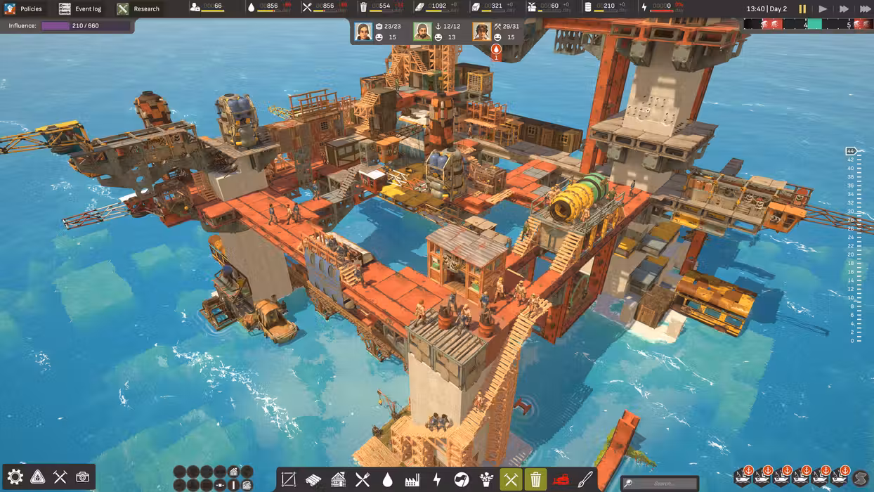 Send the survivors to scavenge the long-lost world, overtaken by the ocean, for precious resources and building space. Receding tides uncover new areas and resource nodes, reachable with machinery, ladders, explosives, and other means.