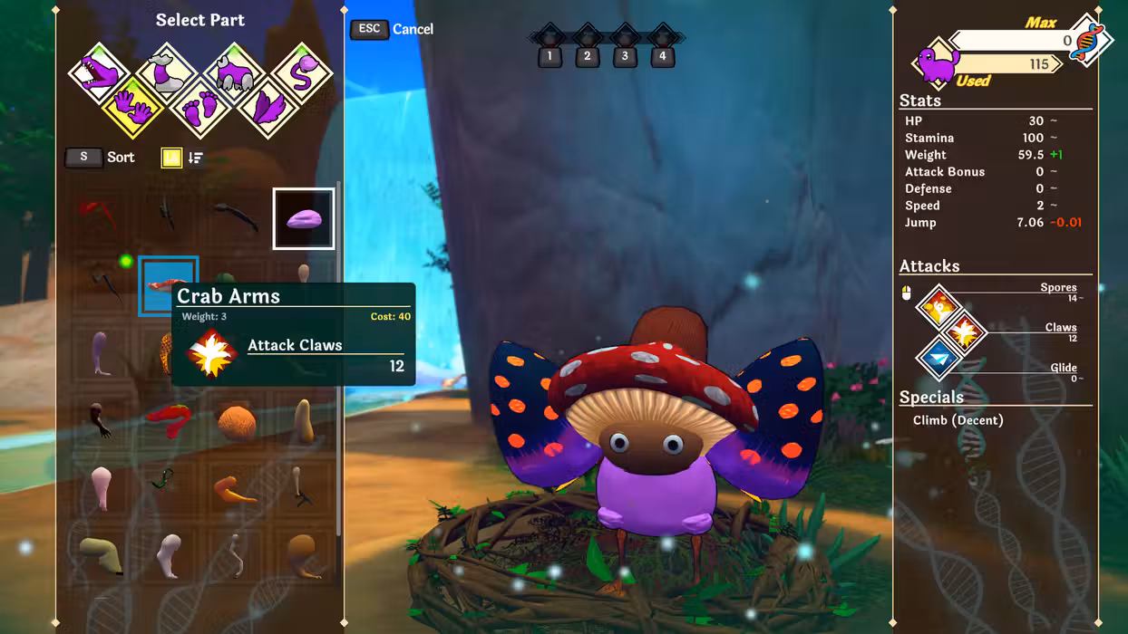 Defeat creatures to collect their DNA and unlock new body parts. Reshape yourself and experiment with combinations to build the ultimate form. But remember that balance is key: a strong torso and powerful head might win fights, but what good is strength if you can’t catch your prey? With 7 part slots and over 40 creatures to discover, you’ll have over 10 million possible combinations to play with.