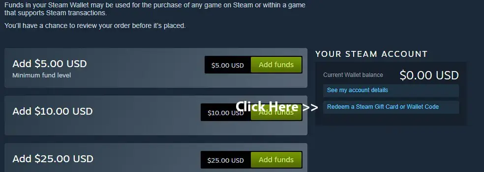 3- انقر فوق "استرداد بطاقة هدايا Steam أو رمز المحفظة"